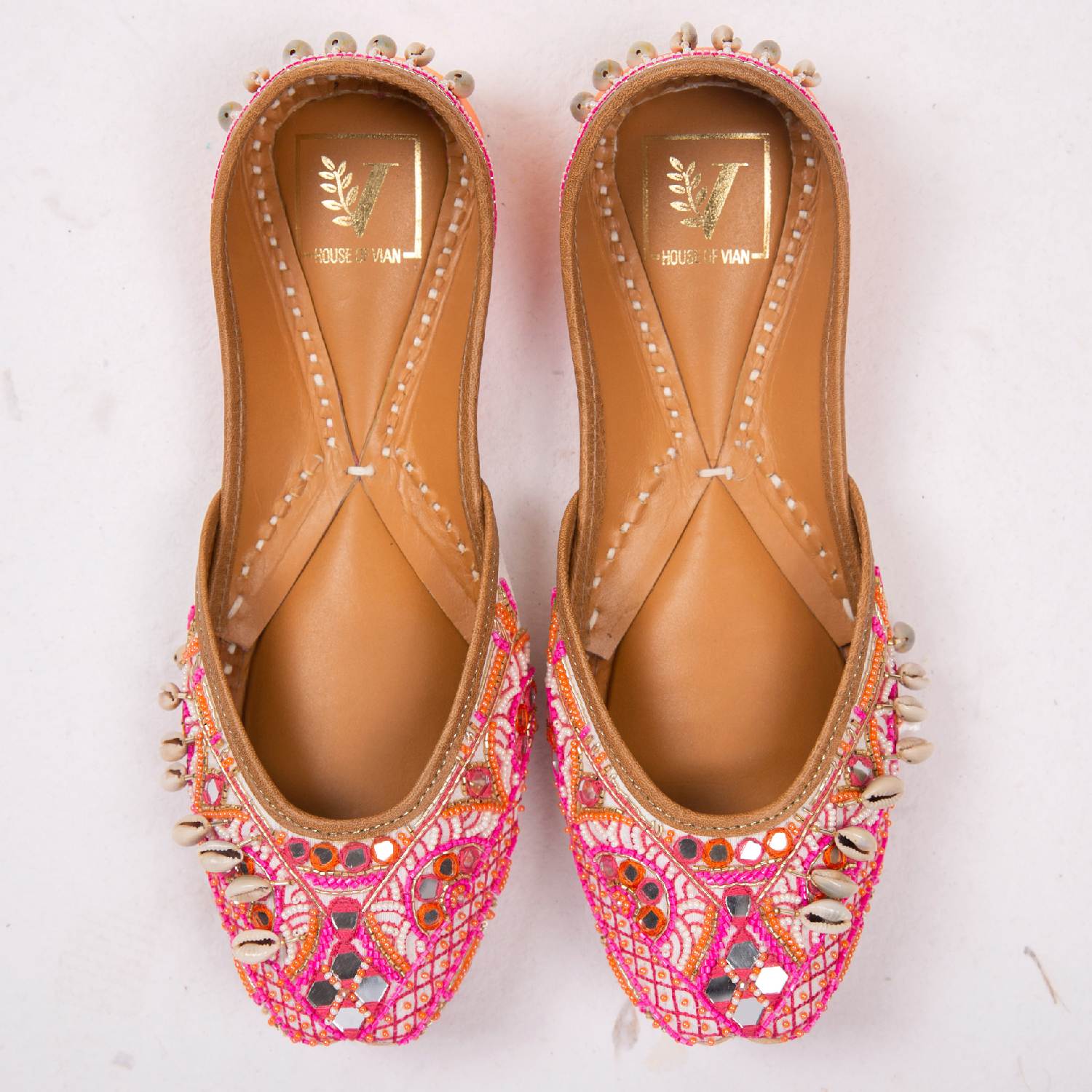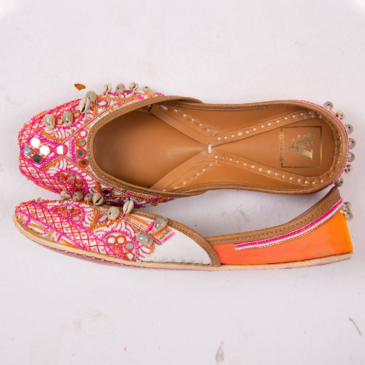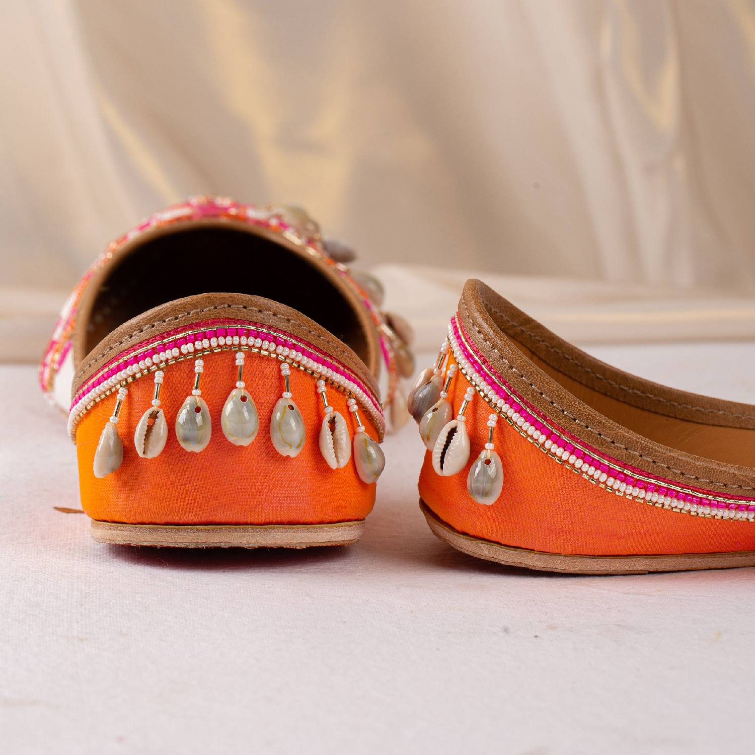 These beautiful juttis are crafted from high-quality crepe material in shades of orange and pink. They are intricately embellished with dabka, beads, cutdana, shells, and mirrors, offering sparkle to the look. Style them with a saree and a clutch for weddings or festivities.