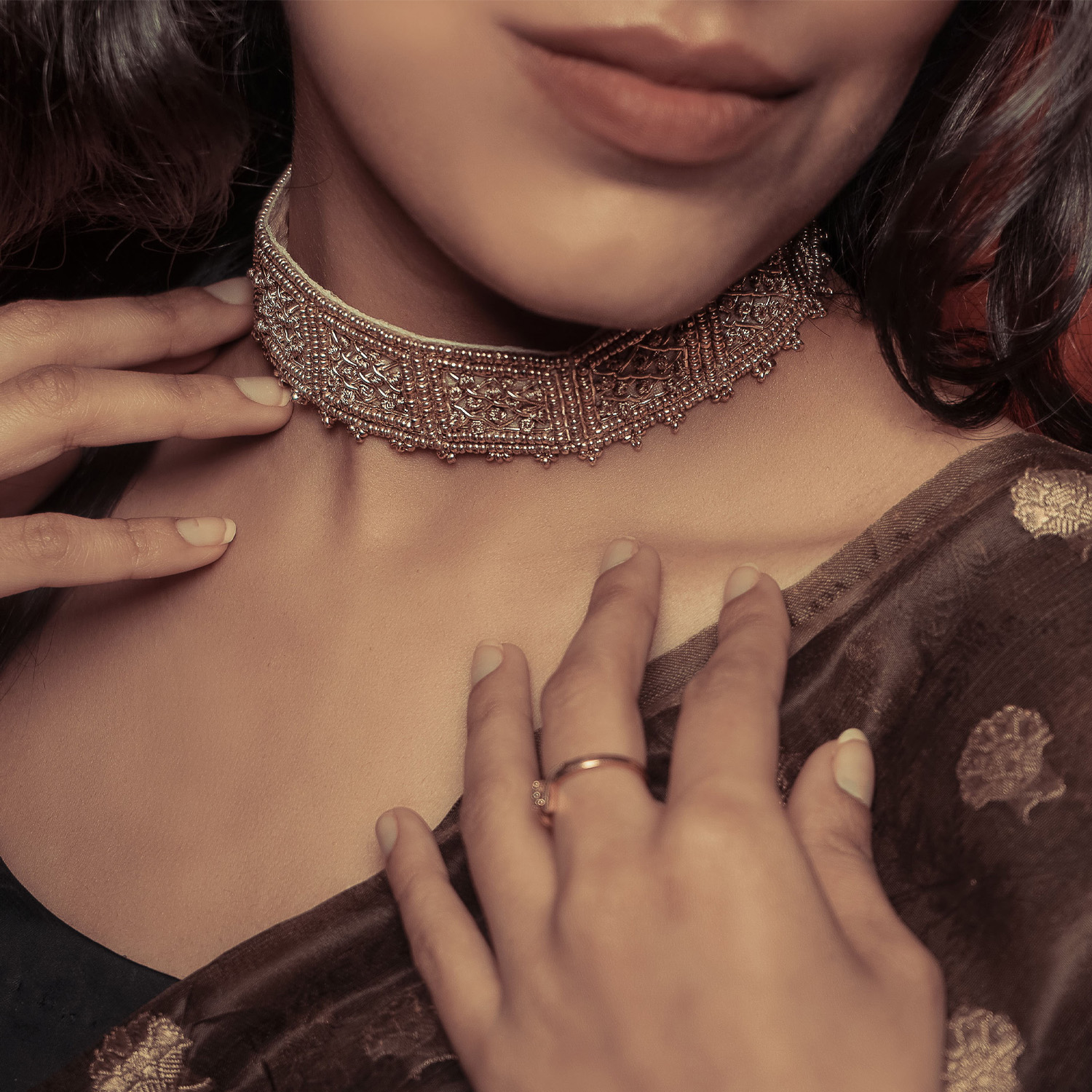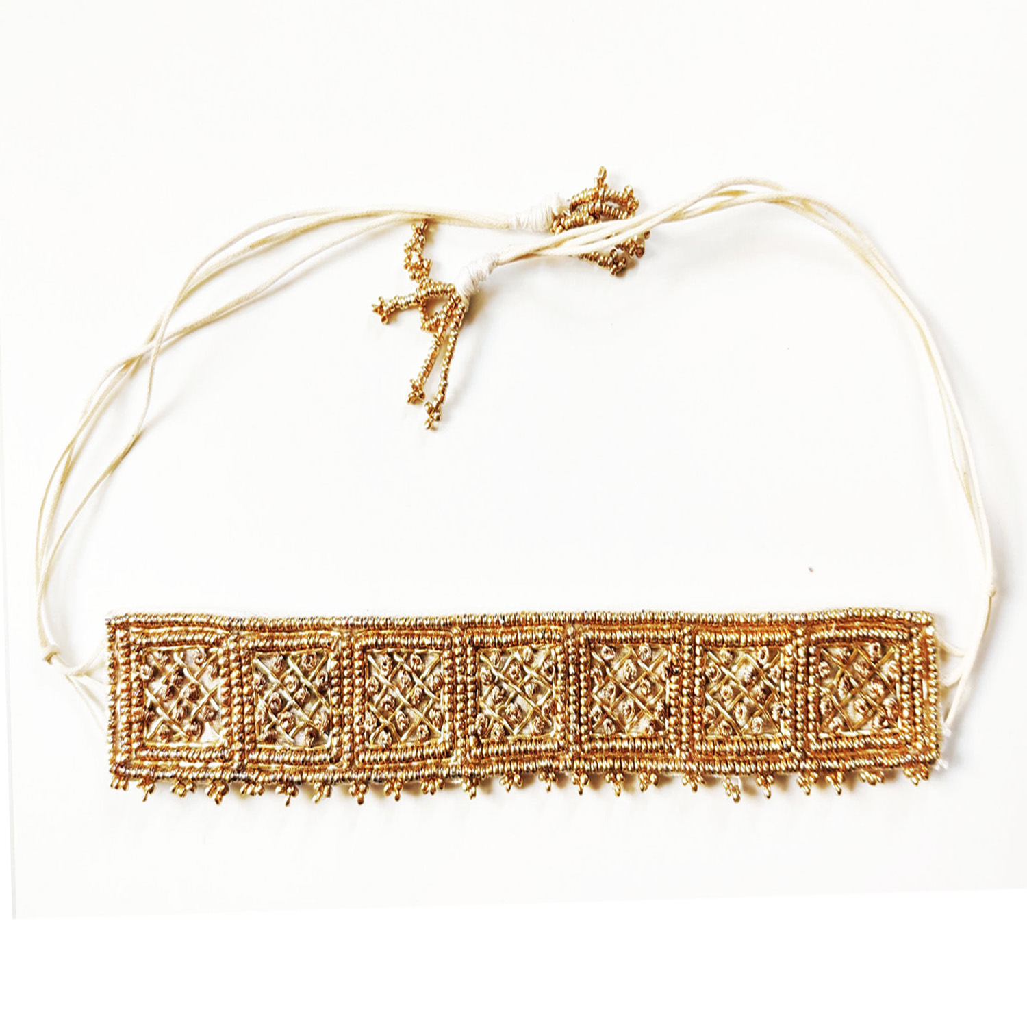 ₹ 2,700 (10% off)This necklace is an exquisite piece of jewellery featuring intricate handcrafted details. It is designed as a choker necklace adorned with gold dabka and zari french knots, complemented by a beaded edge and a tassel dori. Style it with a saree or a kurta for a traditional look.