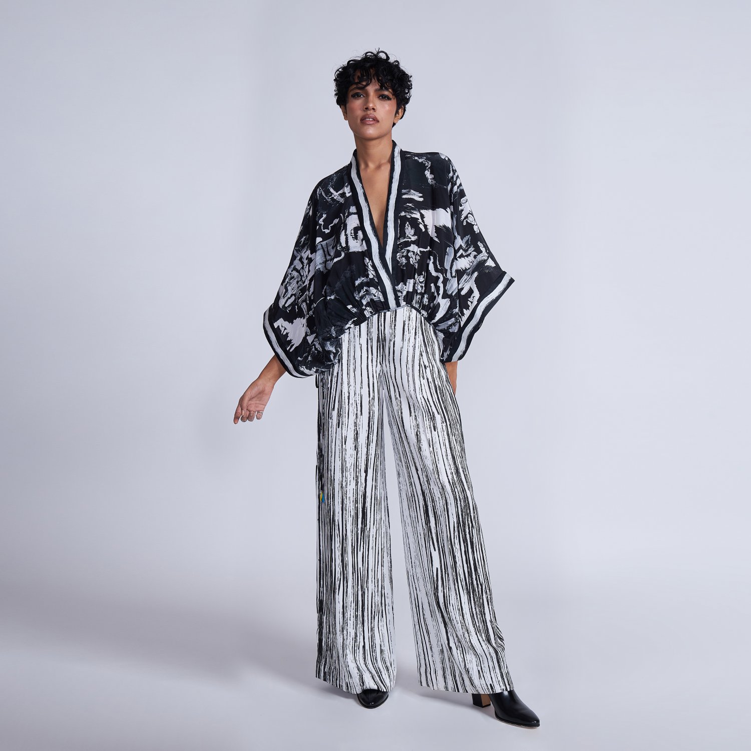 These printed straight-leg trousers combine flair and comfort seamlessly. Adorned with an eye-catching print, they exude contemporary charm. The addition of side pockets enhances practicality without compromising style, making this pair a versatile wardrobe staple that effortlessly merges fashion and functionality for a trendy and polished look.