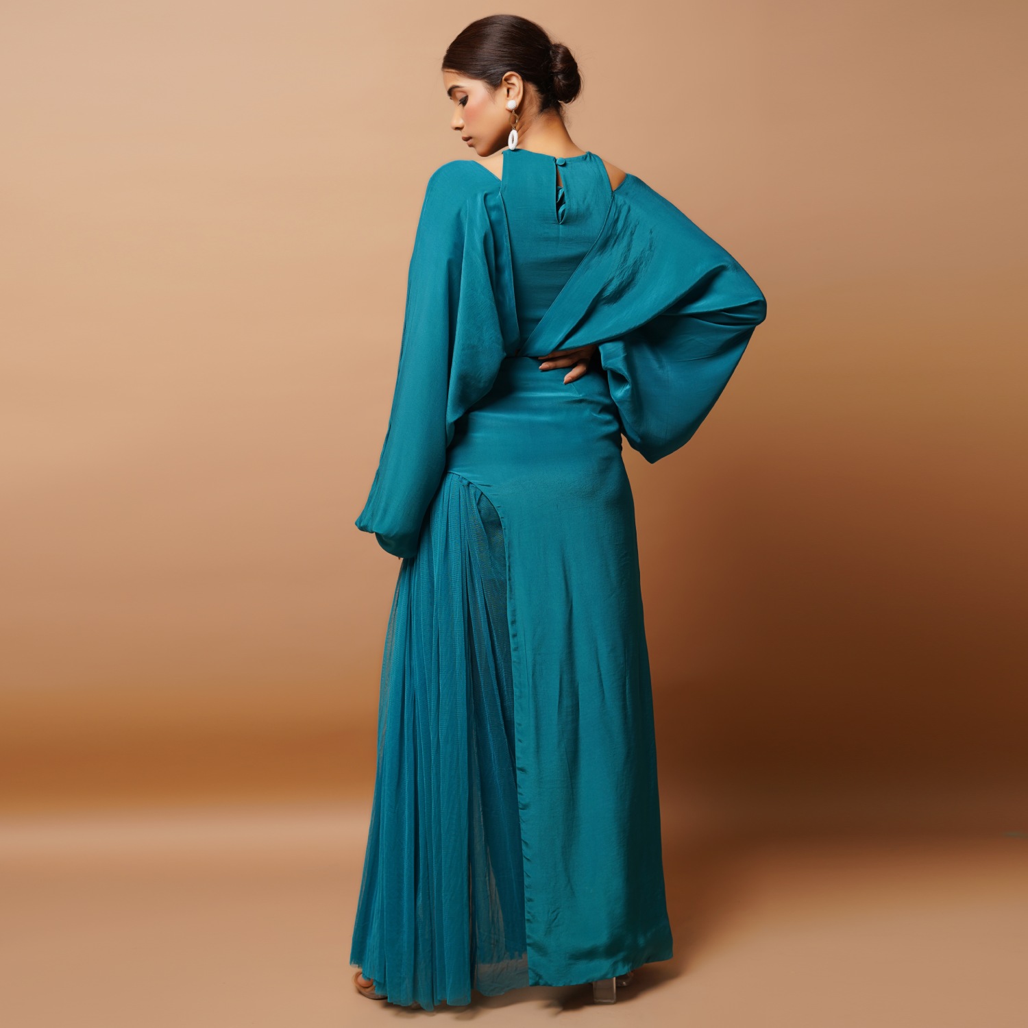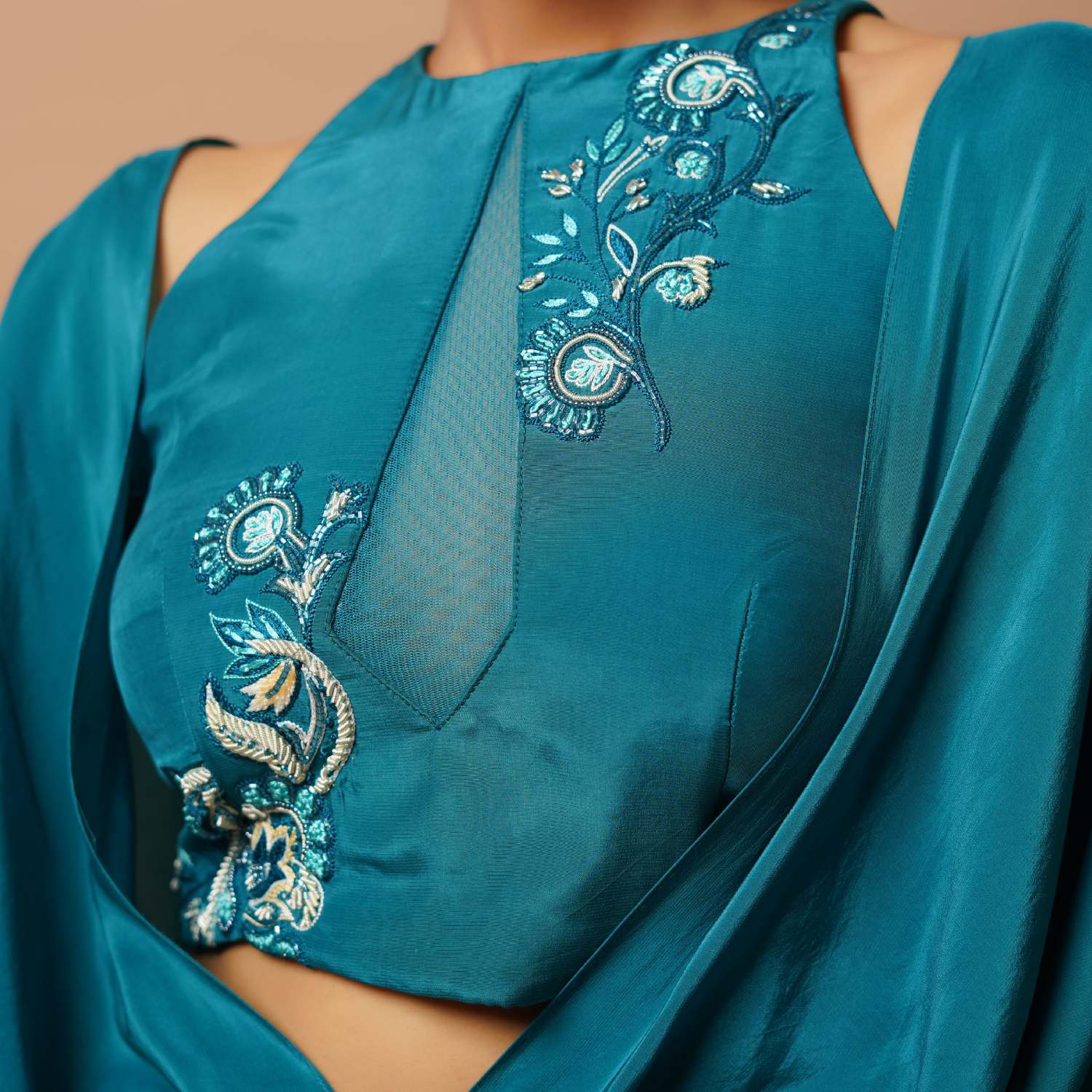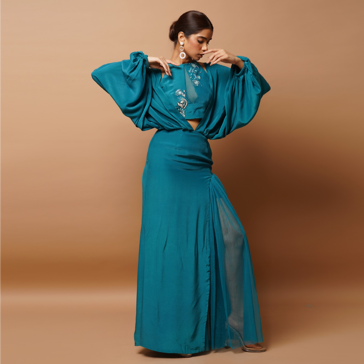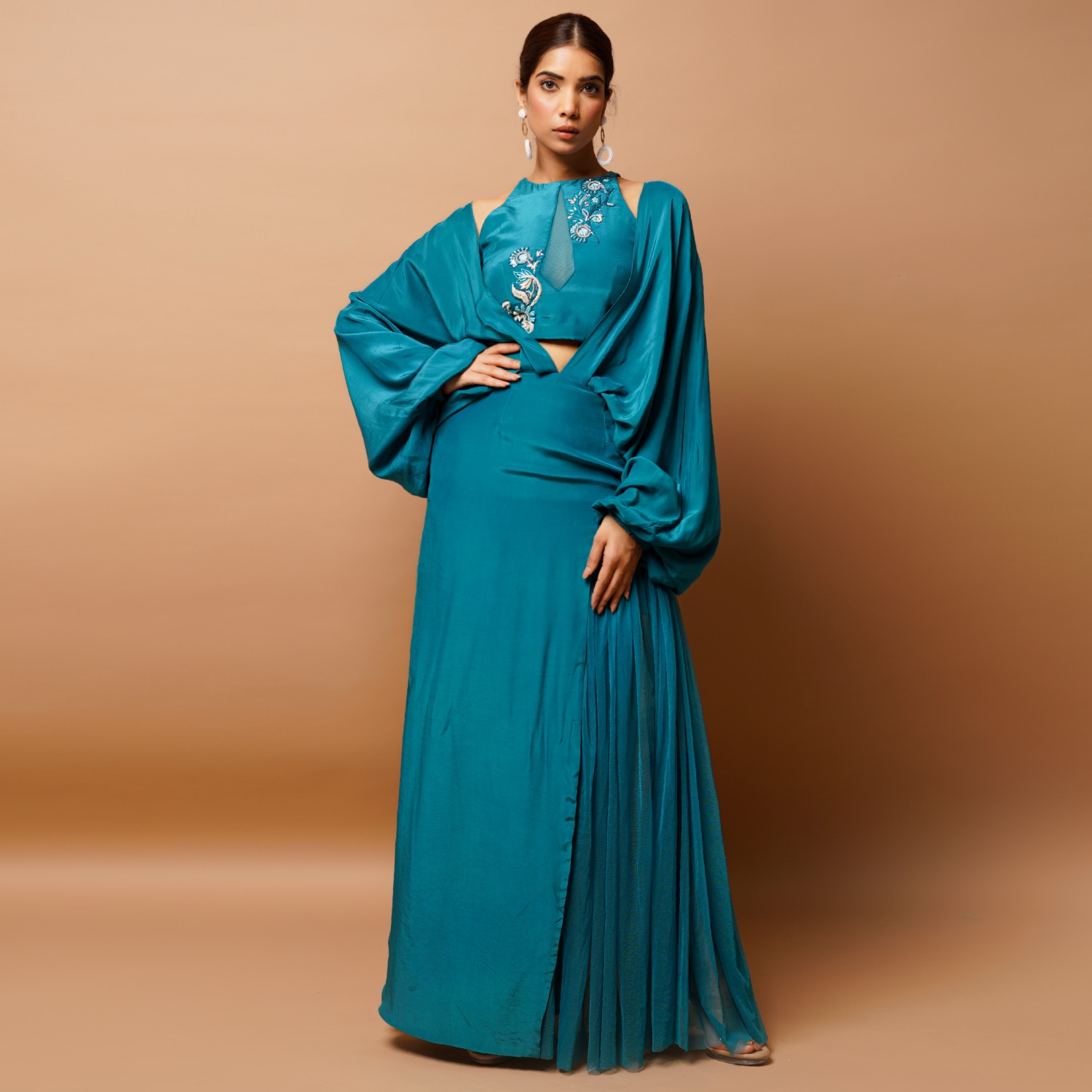 ₹ 18,995 (5% off)Meticulously crafted from high-quality crepe and net, this set comes in a beautiful teal shade. This set includes a full sleeve, halter neck padded bustier, made from crepe, adorned with zardozi, cutdana, threads, and zari work. It is paired with a sophisticated wrap-neck long dress with details of net attached. Pair it with a sleek necklace and a clutch for weddings or festivities.