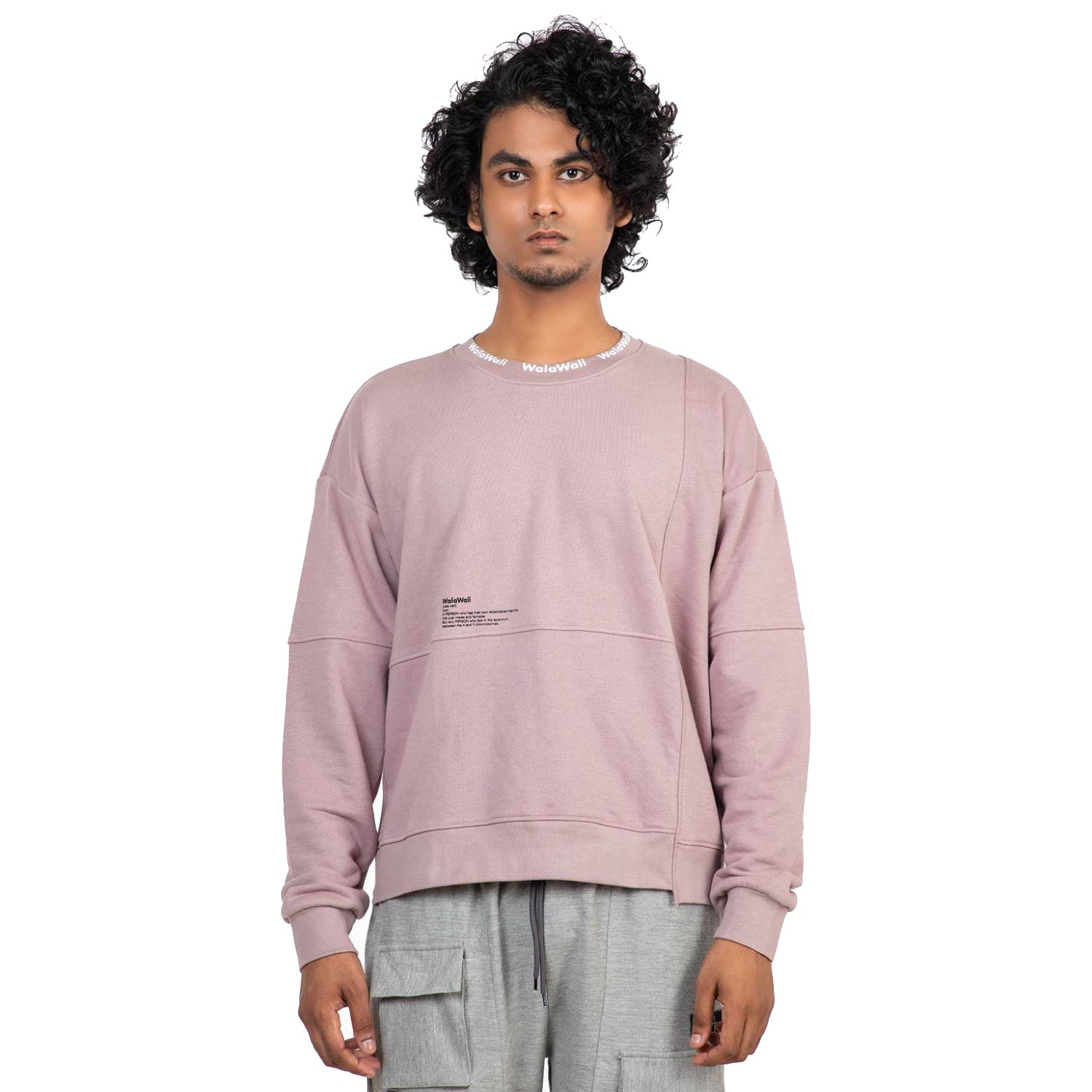 This dusky pink sweatshirt features a luxurious print on the collar and an asymmetrical pattern for a sleek look. This oversized sweatshirt has a cut-and-sew pattern, adding style to the outfit.