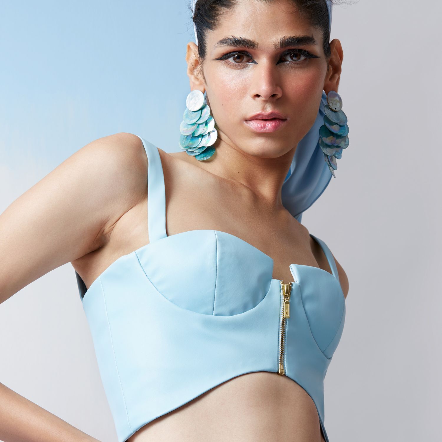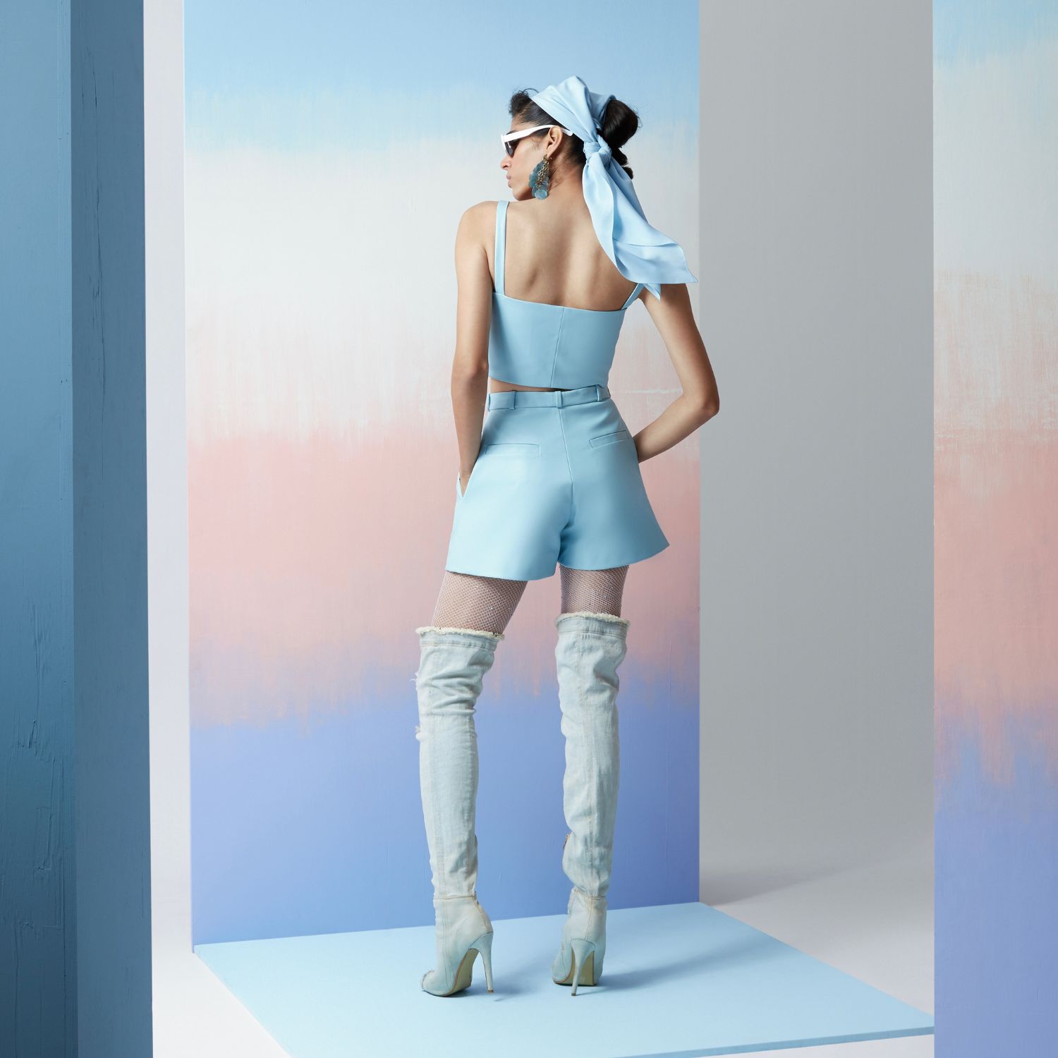 Relax in style with this virshete sky blue tech bustier top and flared shorts. The flowy bustier top and shorts, made from matte vegan leather, are perfect for any occasion. This set will keep you comfortable and cool.