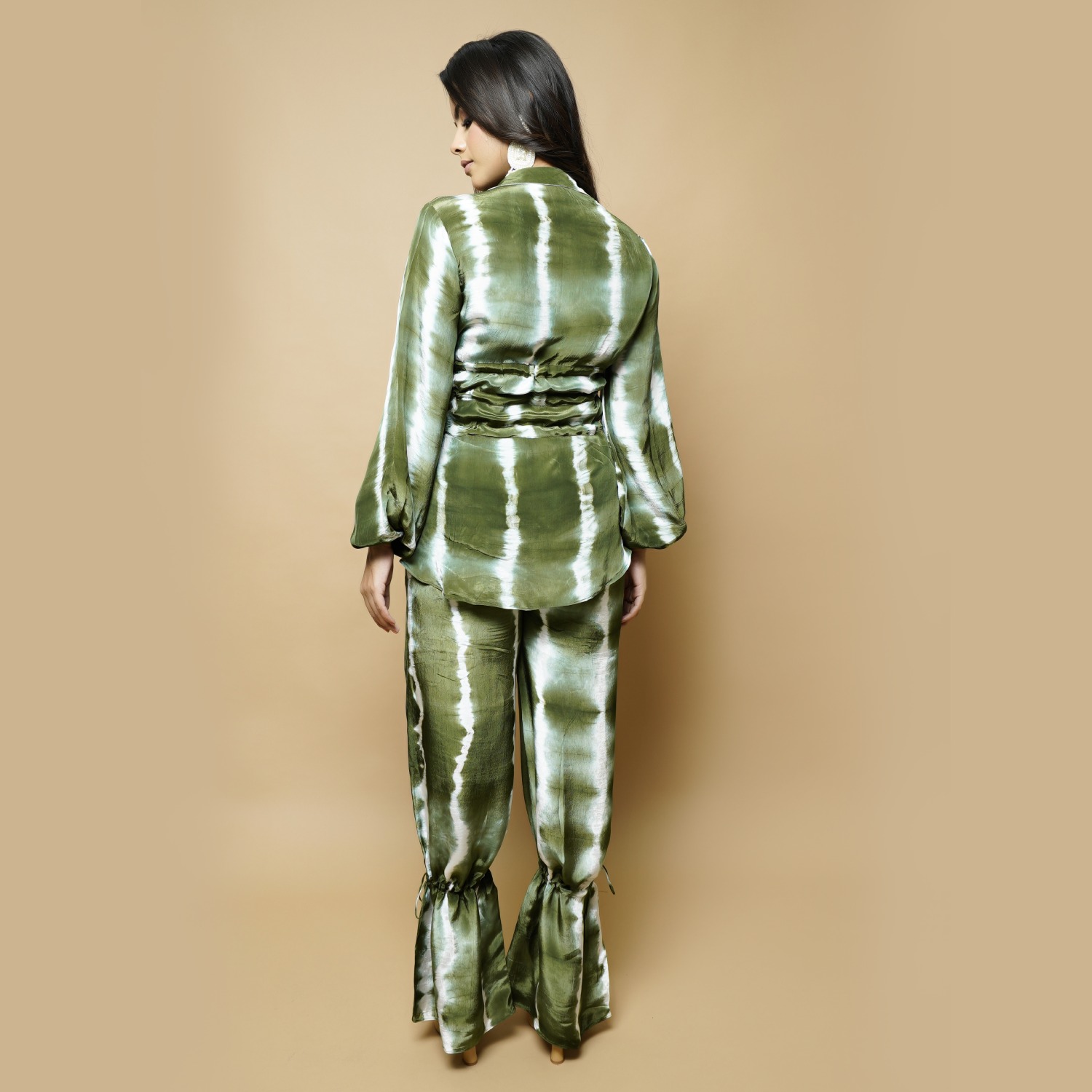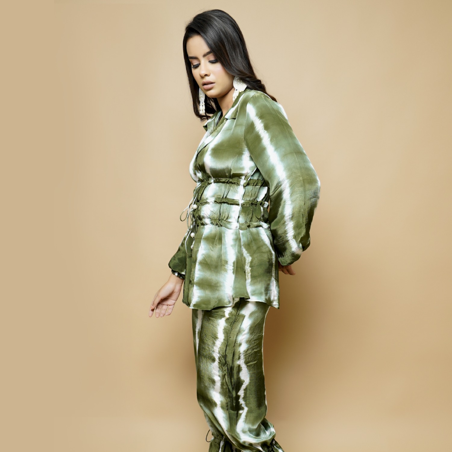 ₹ 9,495 (5% off)This set comprises a drawstring tie-up long shirt with balloon sleeves and pants with a tie-dye green and white pattern. The coordinating pants also come with a tie drawstring hem, creating a cohesive look. Style it with minimal jewellery and a sling bag for a day out with friends.