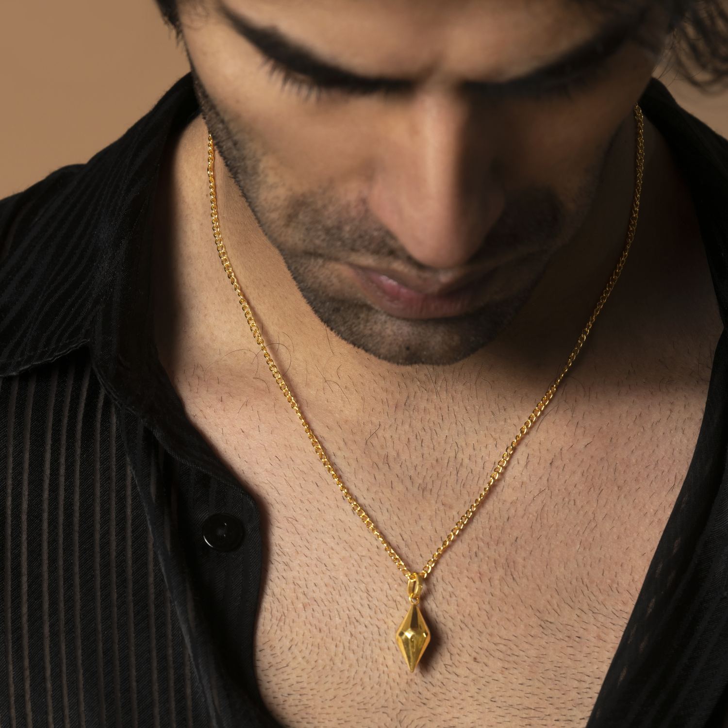 This necklace is a symbolic piece of jewellery, designed in gold-colored brass. This piece can be a unique addition to your wardrobe.