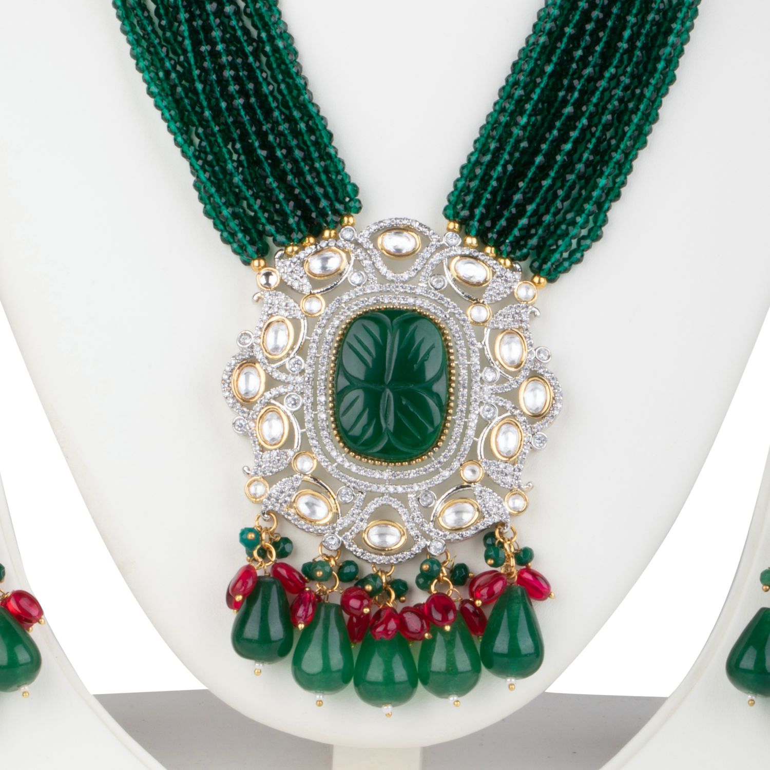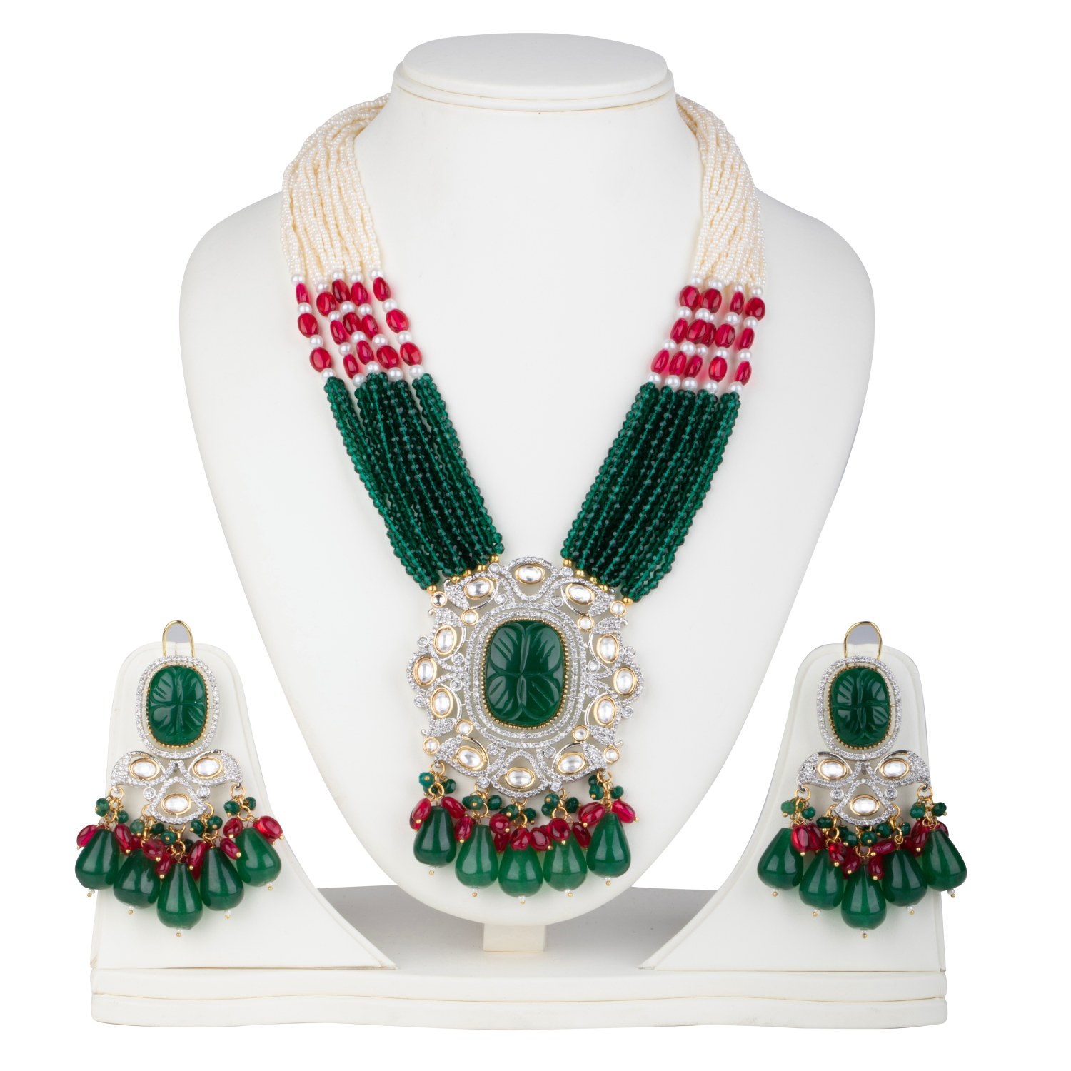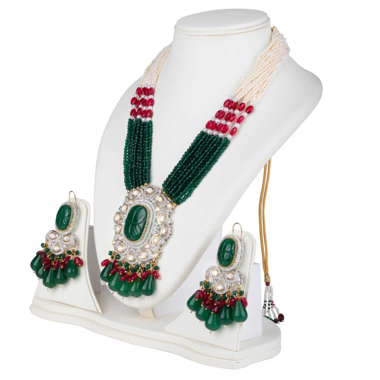 ₹ 16,680 (5% off)The epitome of luxury, Minaki's two-tone long necklace set is a work of art. Crafted with a kundan setting and adorned with emerald-coloured stones, crystals, ruby-coloured beads, and pearls, this piece features an antique finish in mixed metal. The matching earrings complete the look, making it perfect for any occasion.