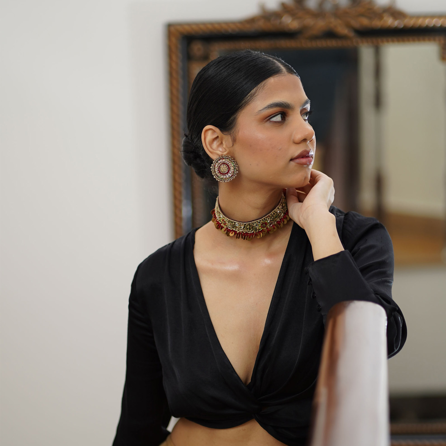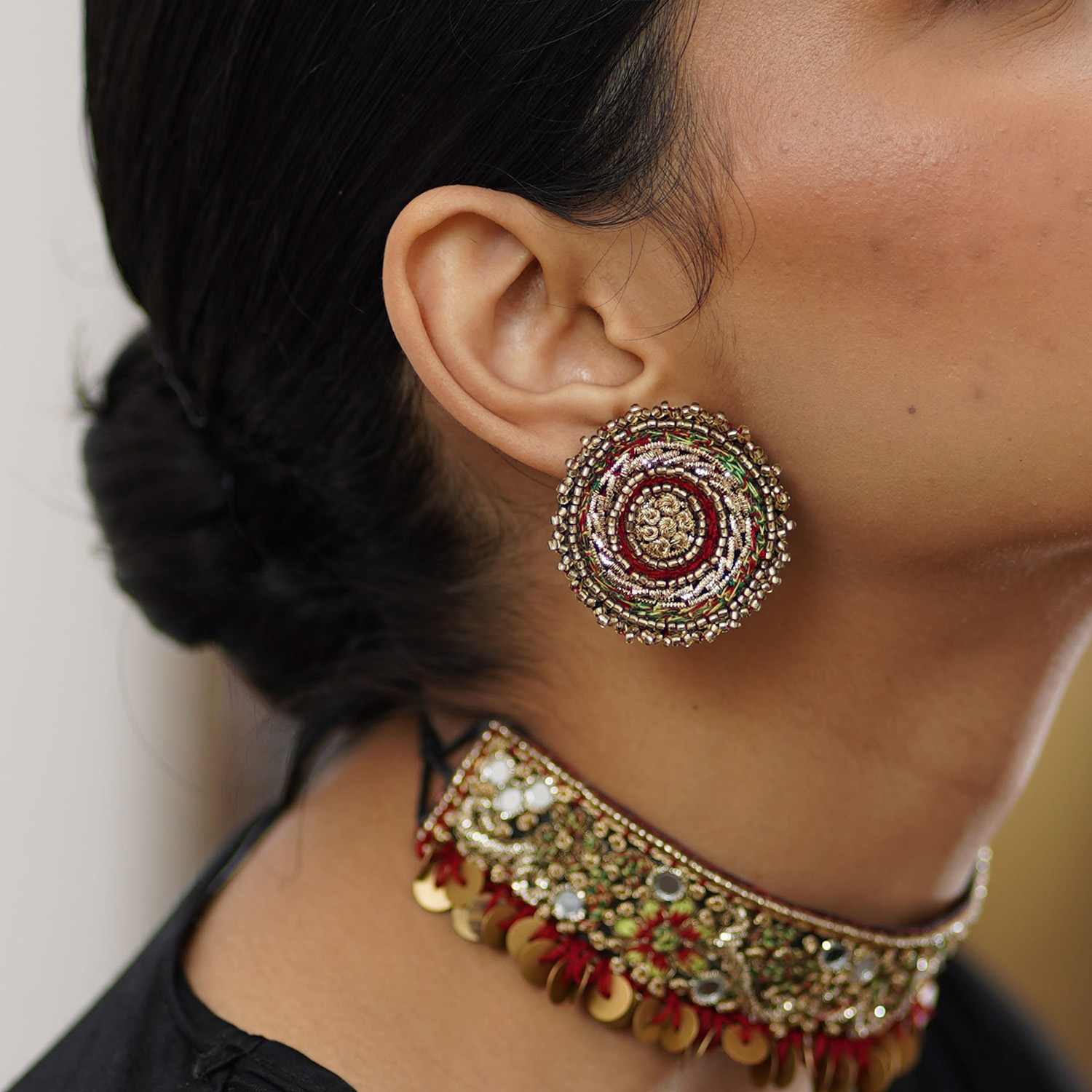 These handcrafted studs feature a blend of intricate threadwork, vibrant colors and zardozi work, creating a unique design. Style it with a kurta or dress for a dressy day event.