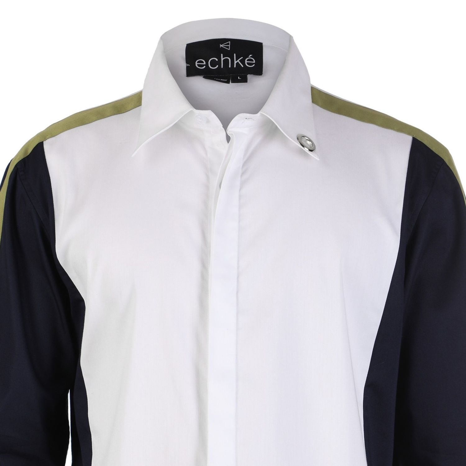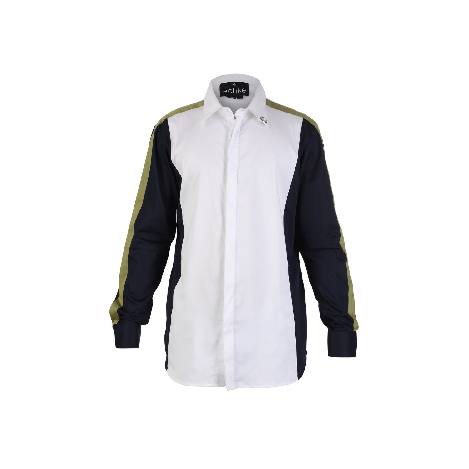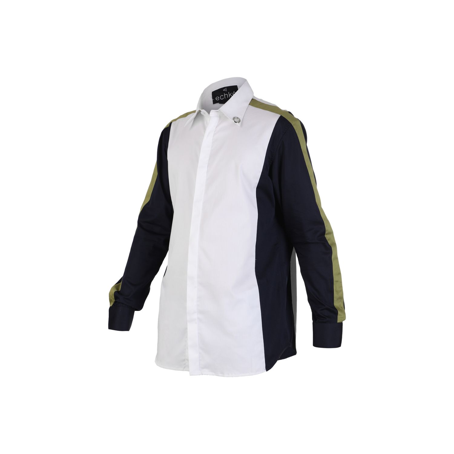 Channel your inner fashionista with this one-of-a-kind white shirt that boasts stylish blue wings and a sleek moss-green stripe. The lightweight cotton-blend material ensures all-day comfort without sacrificing style.