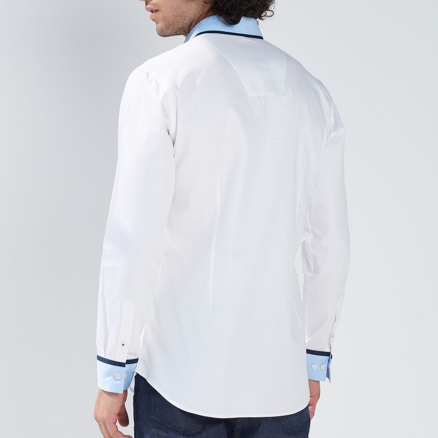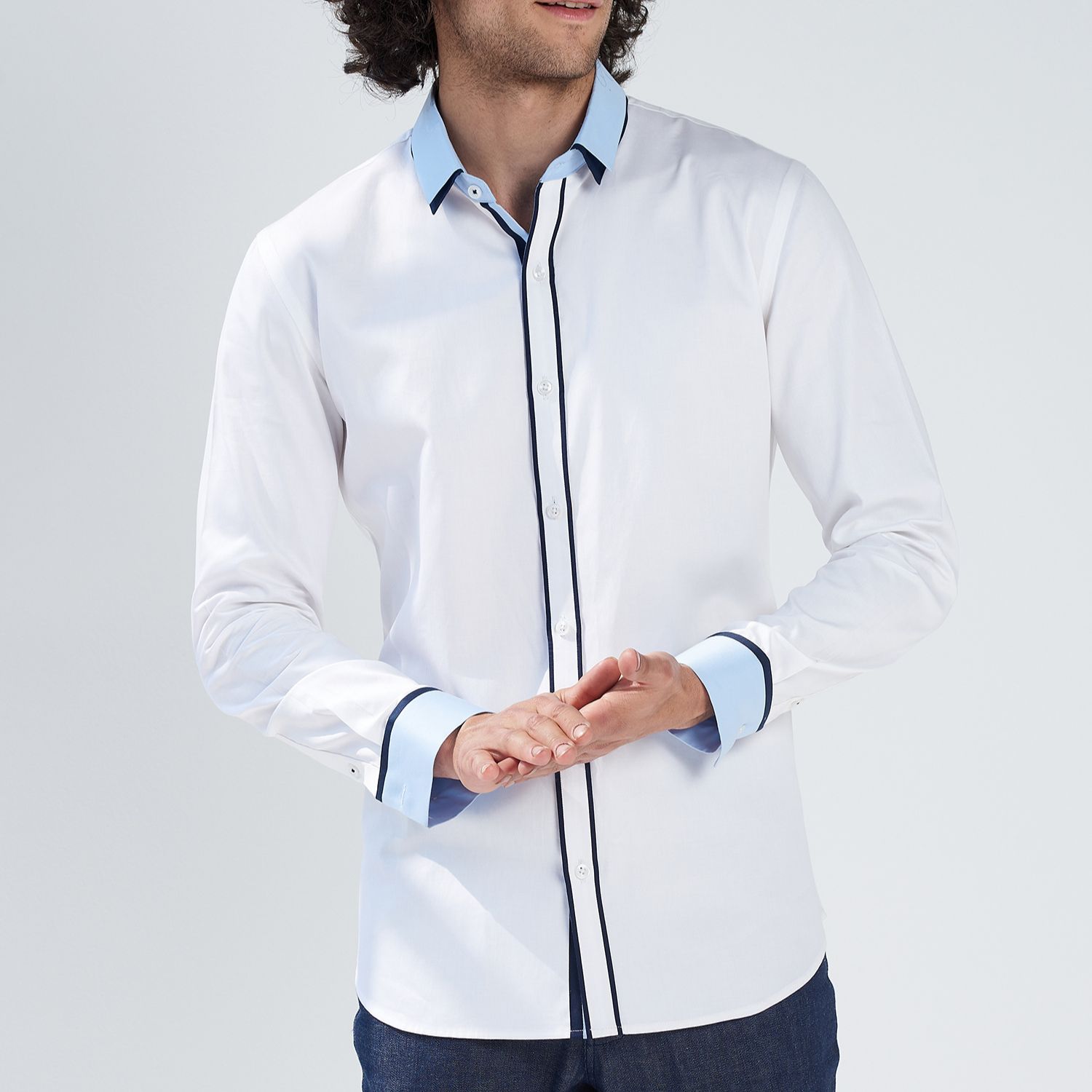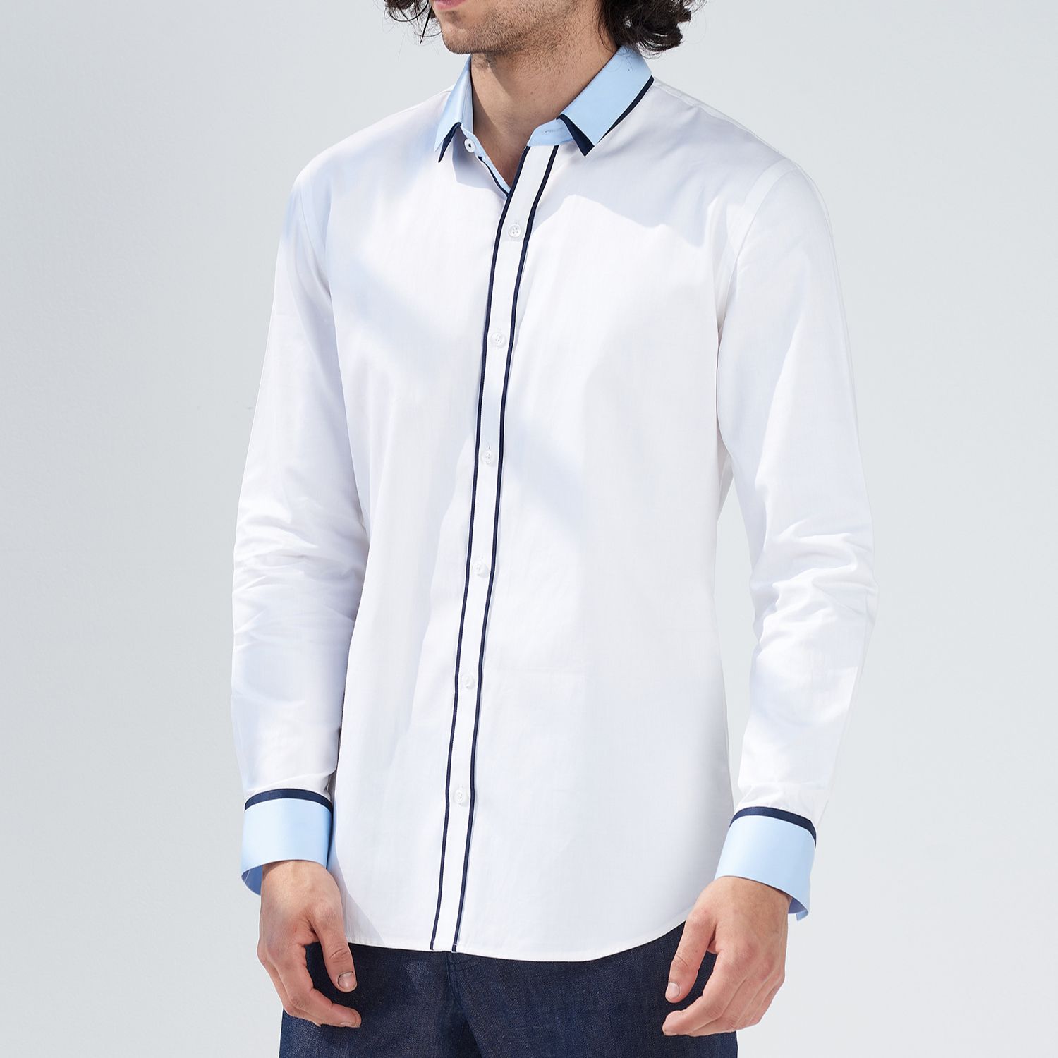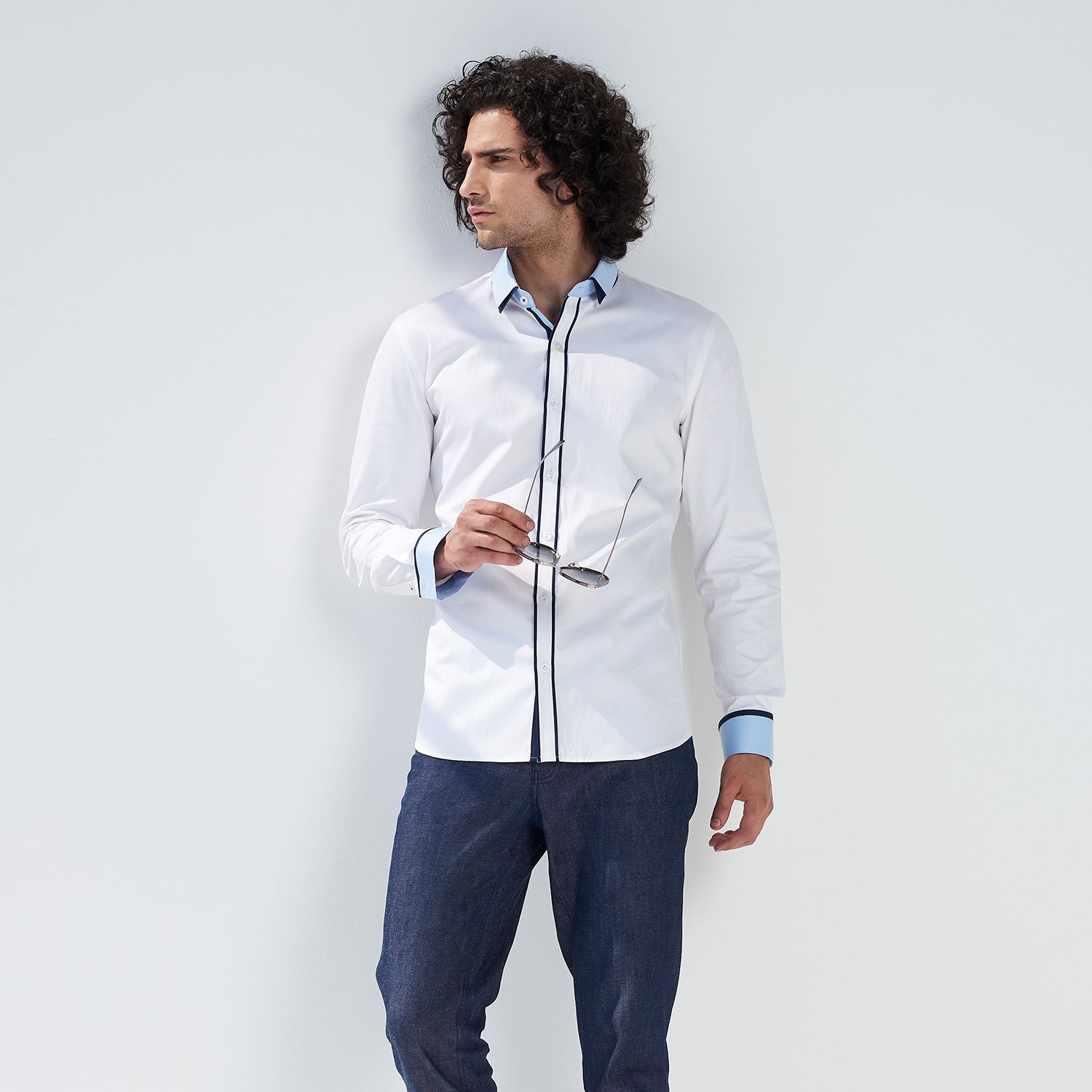 This stylish white color blocked shirt features subtly stripe details. The light blue collar and cuffs add a pop of color to this classic piece. Style this shirt with jeans or beige trousers for an effortlessly stylish look.