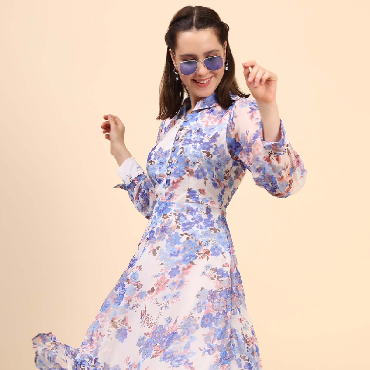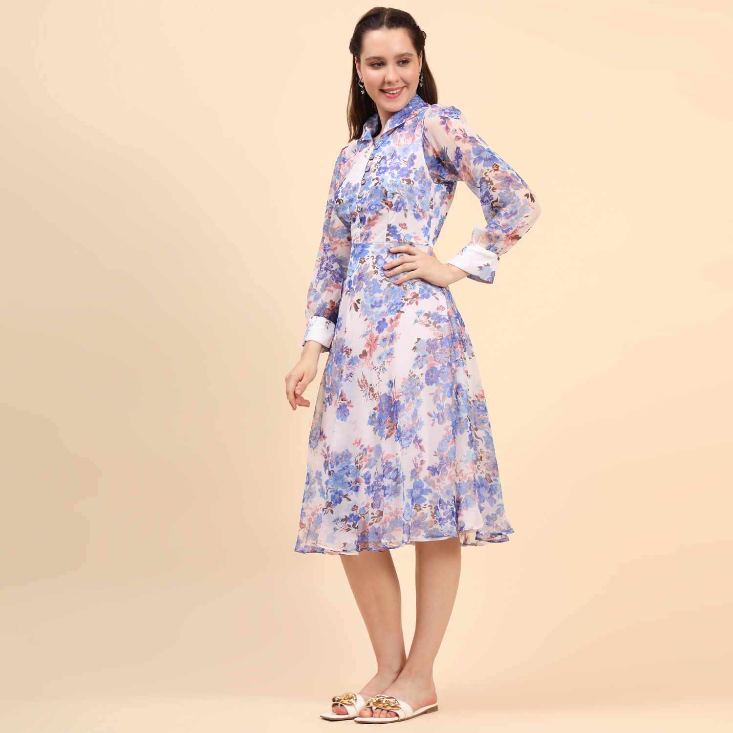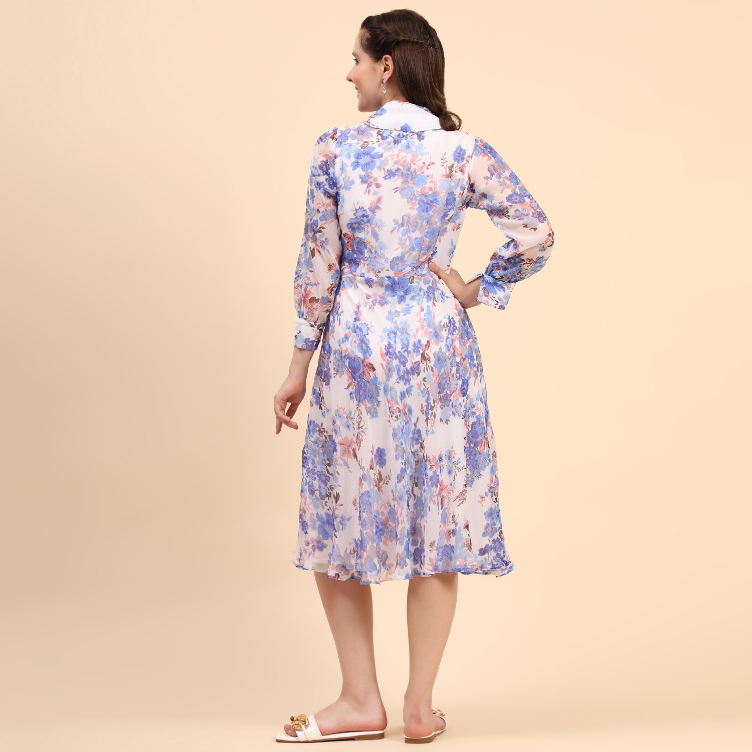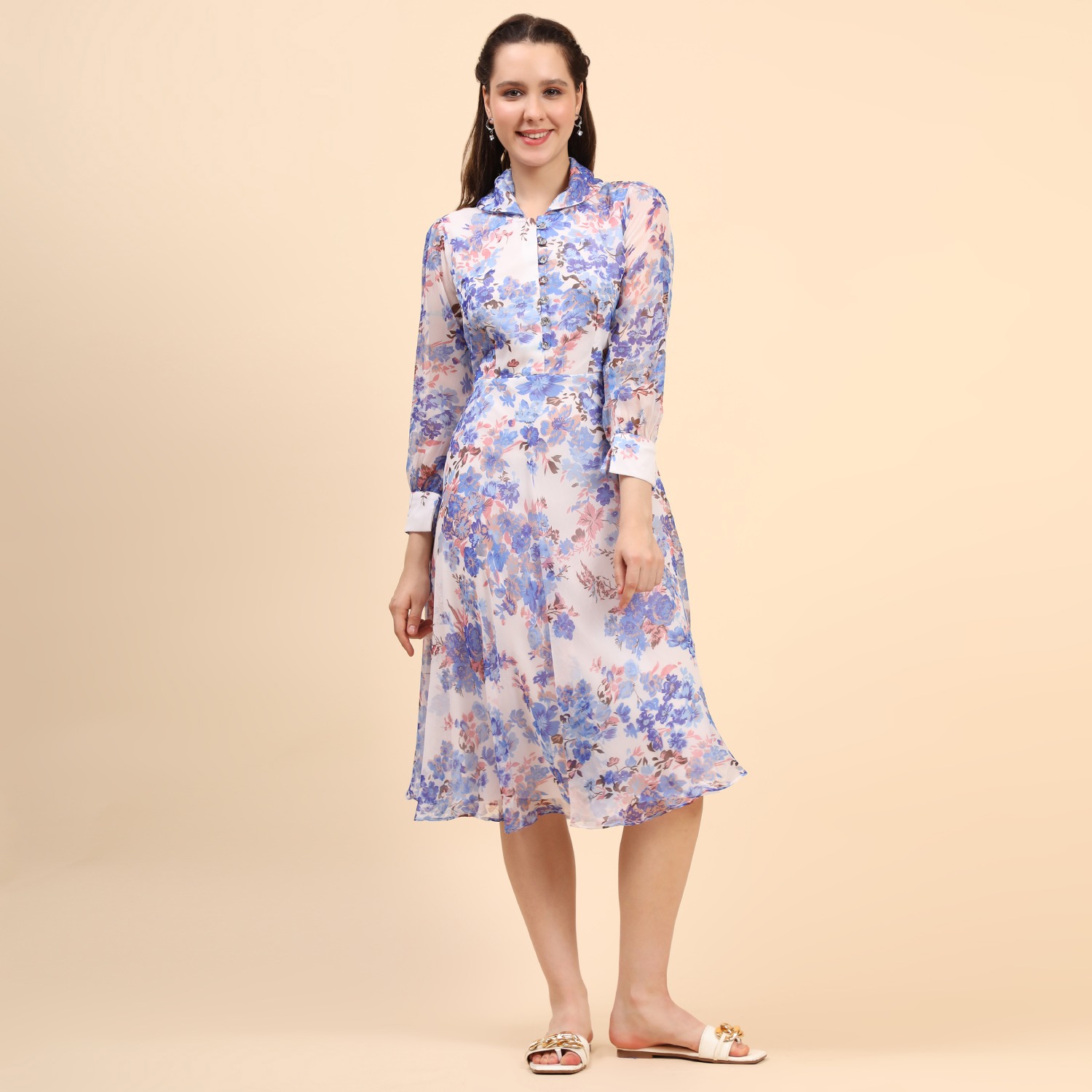 ₹ 2,700 (20% off)This beautiful midi-length dress features a floral print with, adding elegance to your look. It is crafted from a combination of chiffon and hosiery materials, ensuring both comfort and style. The dress is designed with a collar, neckband, and cuff-length sleeves, providing a classic and refined appearance. Pair it with pearl earrings and white sandals for a dressy day out.