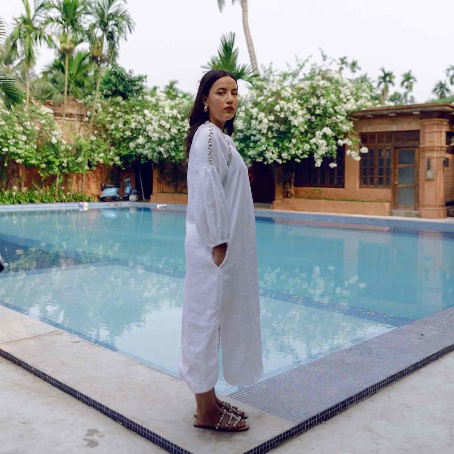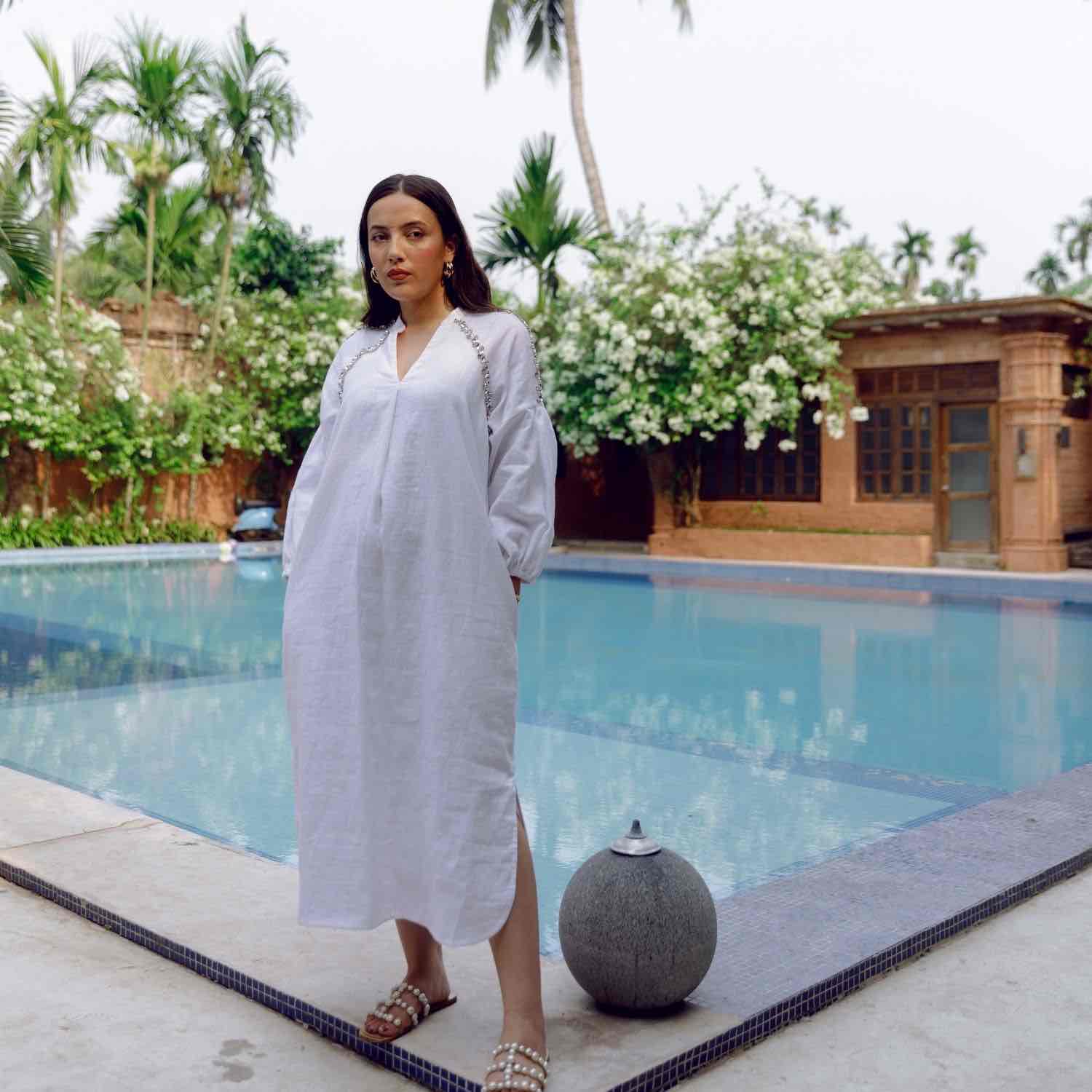 Our white linen straight cut midi dress is truly a classic.The dress features delicate crystal embellishments and a graceful straight cut silhouette. This dress is perfect for the summer time. Style it with understated accessories and a bright handbag to complete the look.