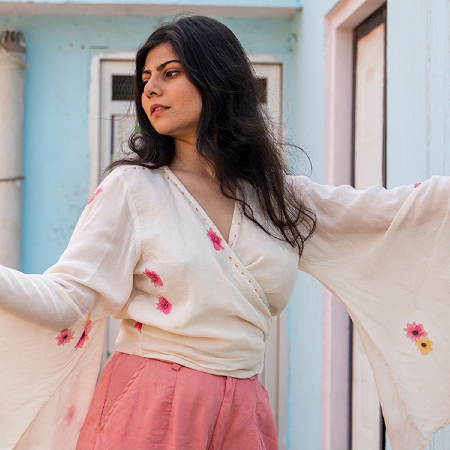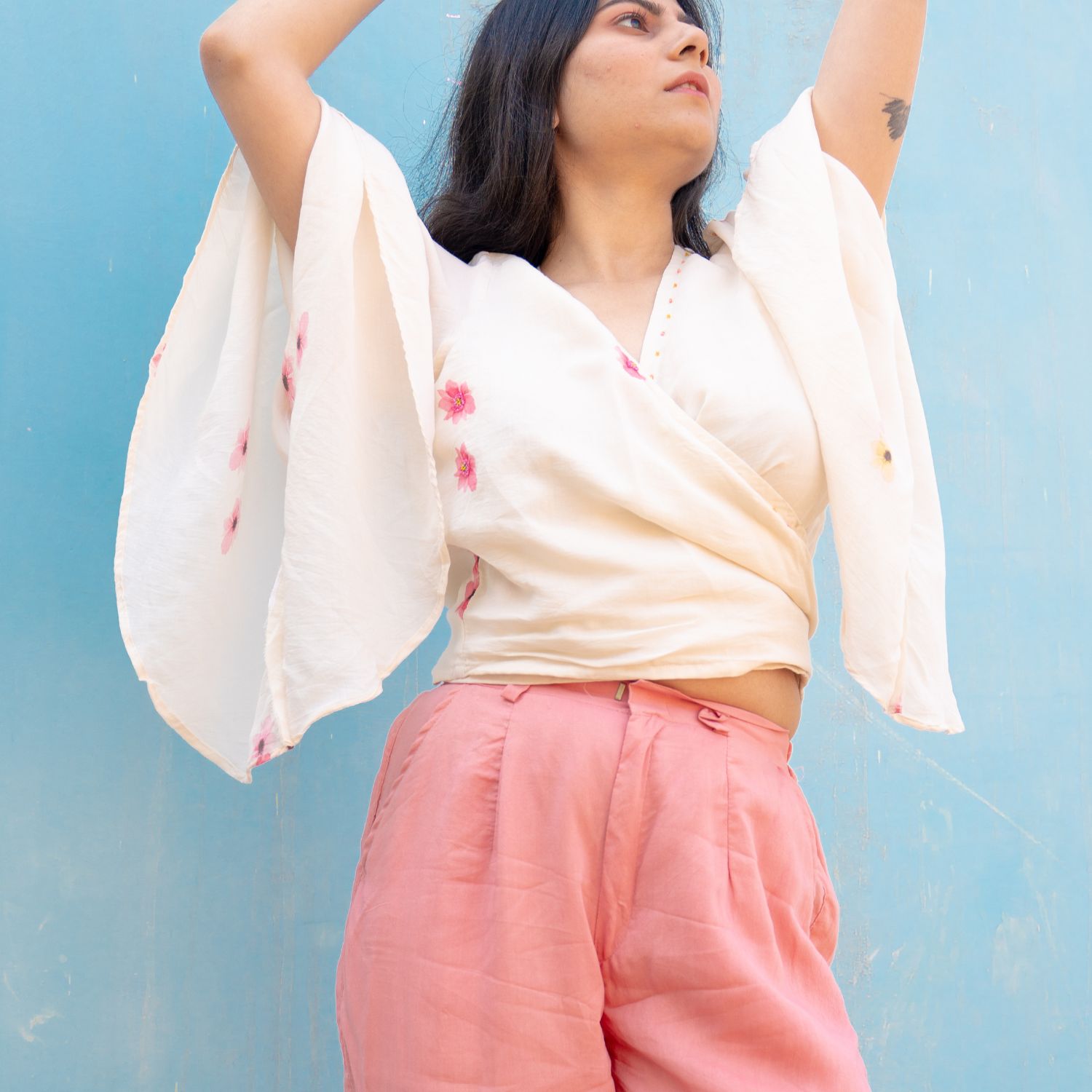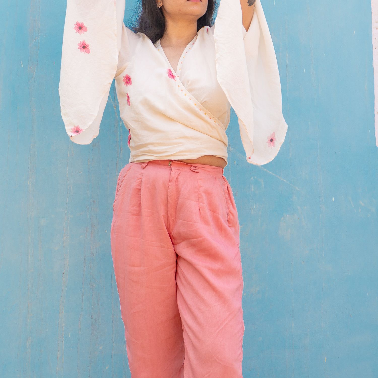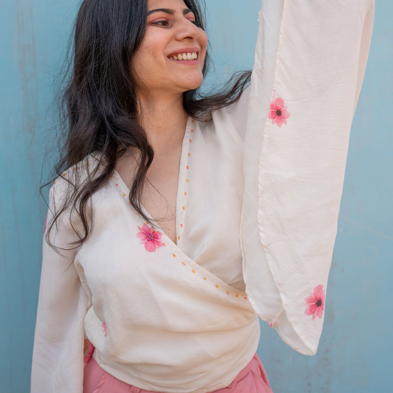 This breezy silk cotton wrap top heatures a delicate pink floral print & flowy bell sleeves. It is perfect for a casual day out and can be styles with trousers for an effortlessly chic look.