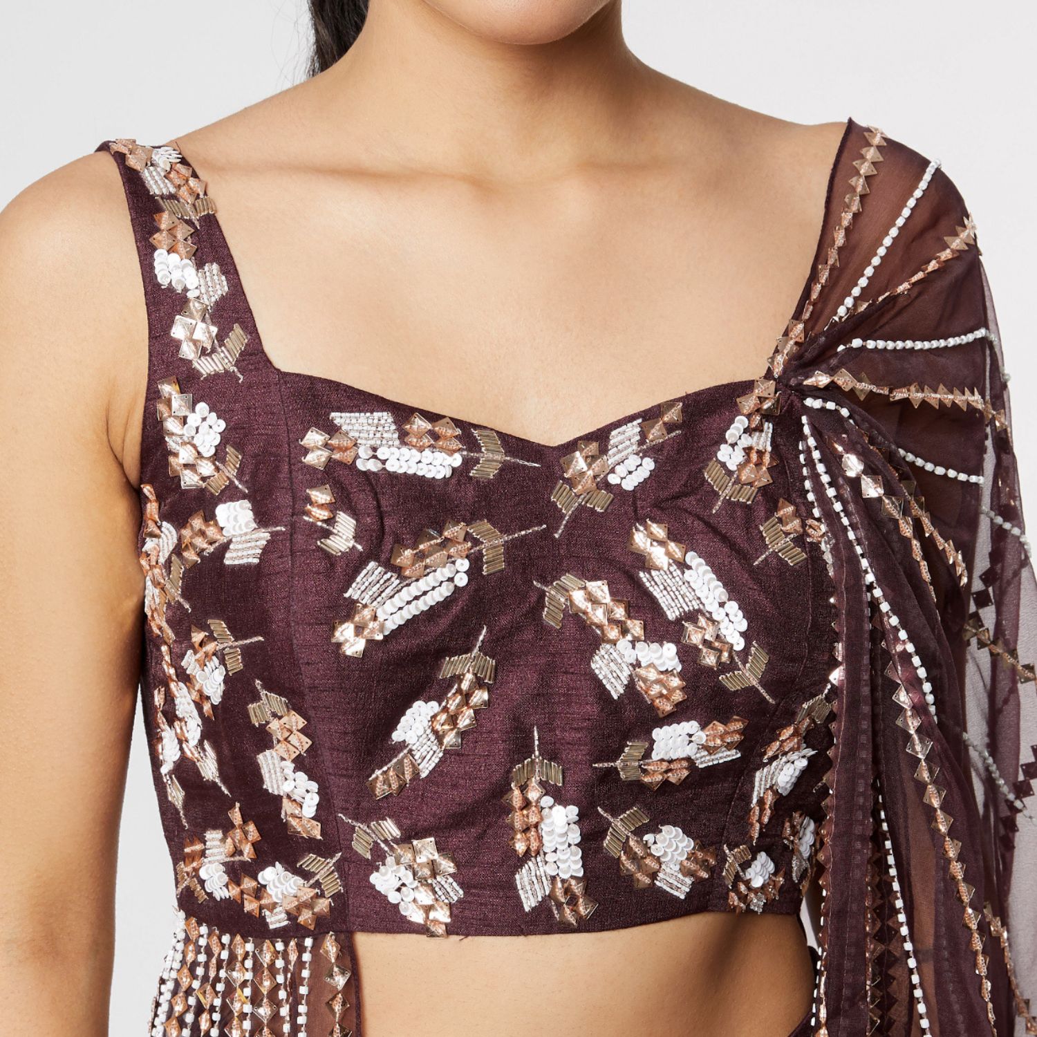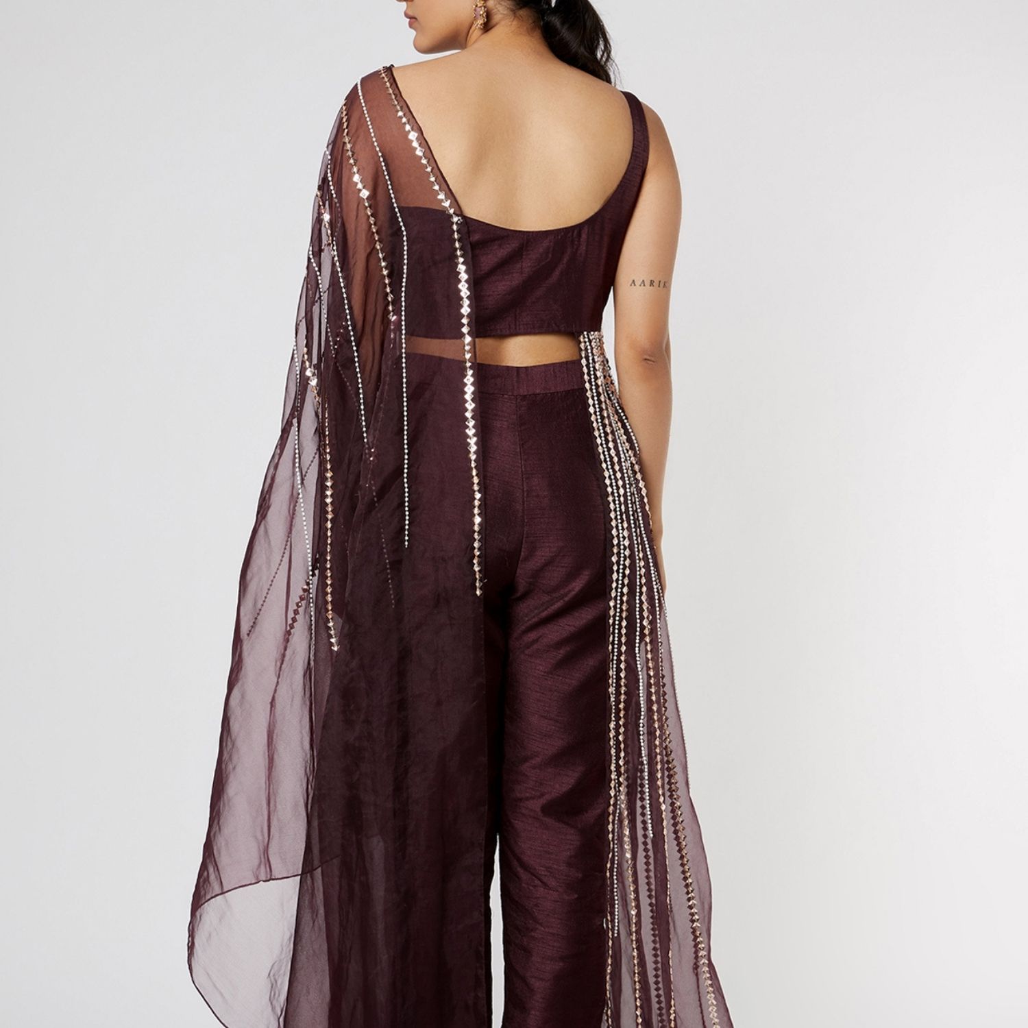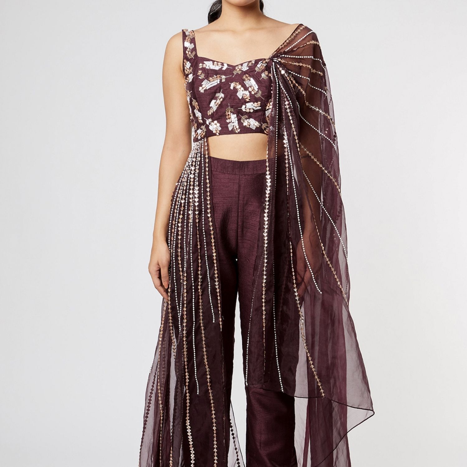 ₹ 30,000 (10% off)Introducing this wine-hued blouse, crafted from a combination of dupion and organza fabric. This exquisite piece showcases aari floral embroidery. Paired with matching pants, it creates a stylish and coordinated ensemble. Perfect for both formal and semi-formal occasions, it exudes sophistication and charm.