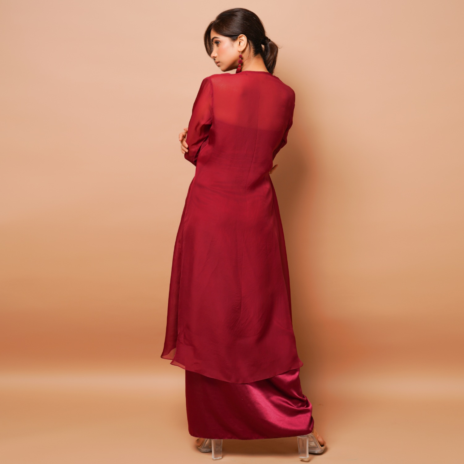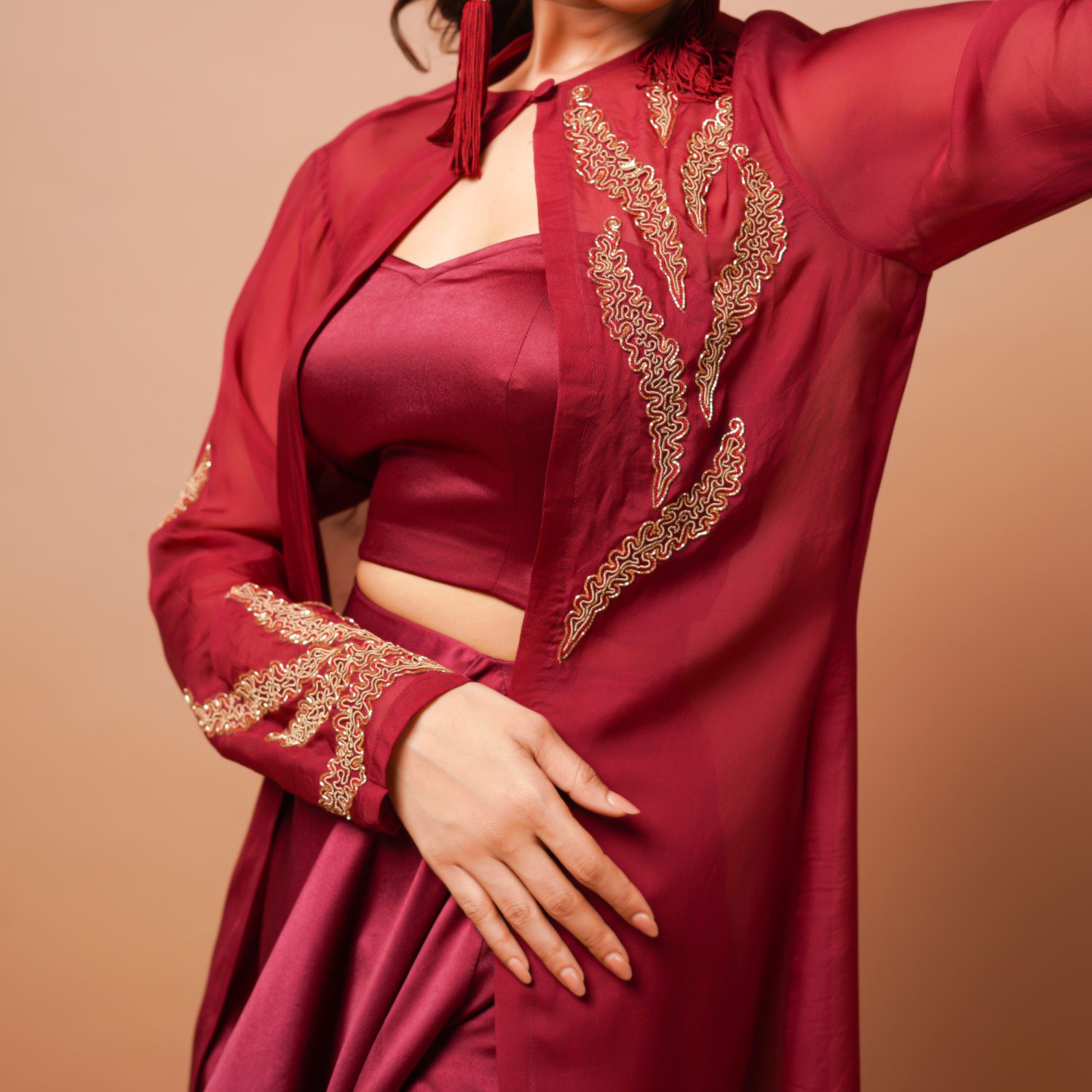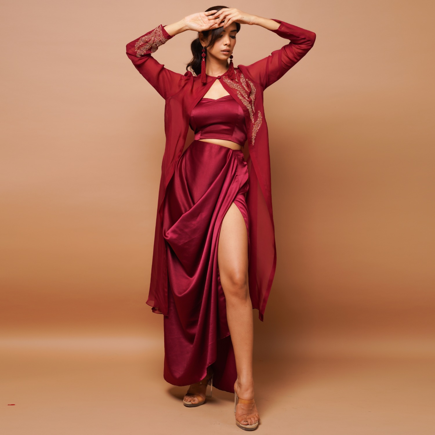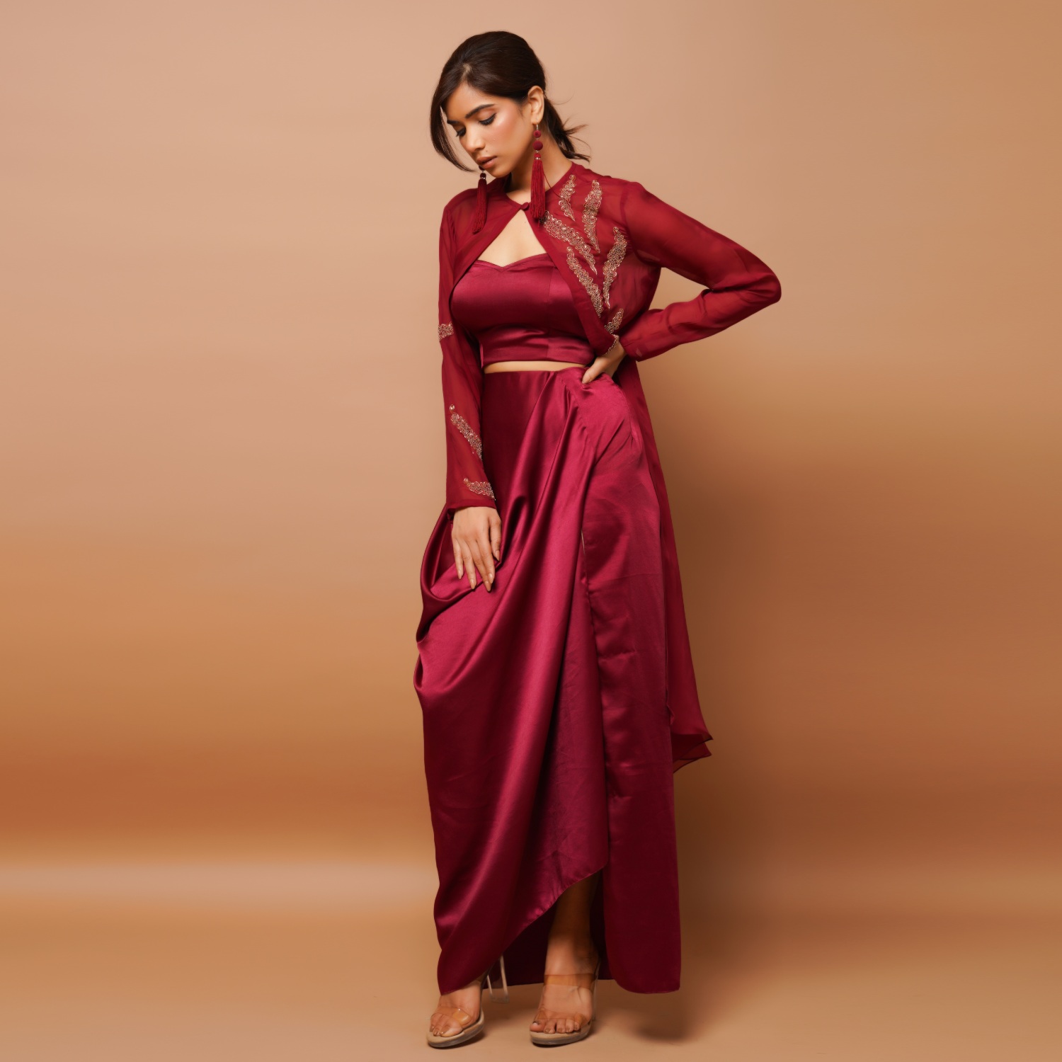 ₹ 20,995 (5% off)This beautiful set is crafted from wine satin and organza, combining the luxurious look of satin with the intricate details of organza. The off-shoulder padded bustier is a fashionable choice with a modern off-shoulder design. The high waist drape cowl skirt is designed with a slit, creating a stylish and contemporary look. The full sleeve long shrug stands out with intricate embellishments of zardozi, zari, cutdana and thread work, adding shimmer and intricate detail to the design.