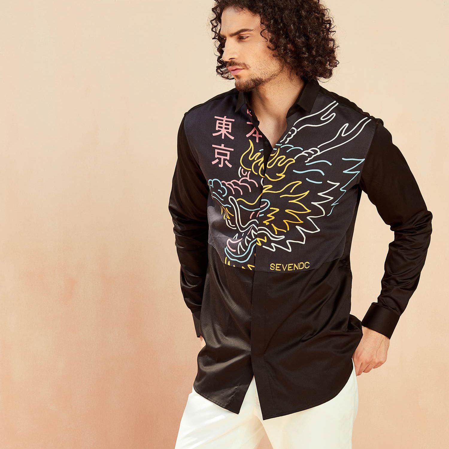 This shirt exudes boldness with its dragon print motif on a luxurious cotton satin fabric. The striking combination of the dark hue and the intricate design creates an aura of mystery and strength, embodying the essence of the enigmatic underworld.
