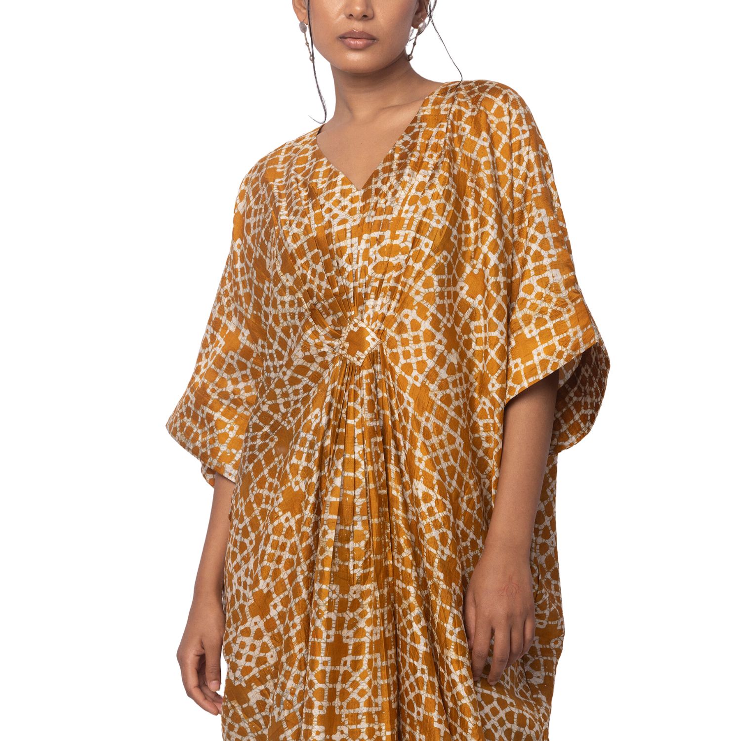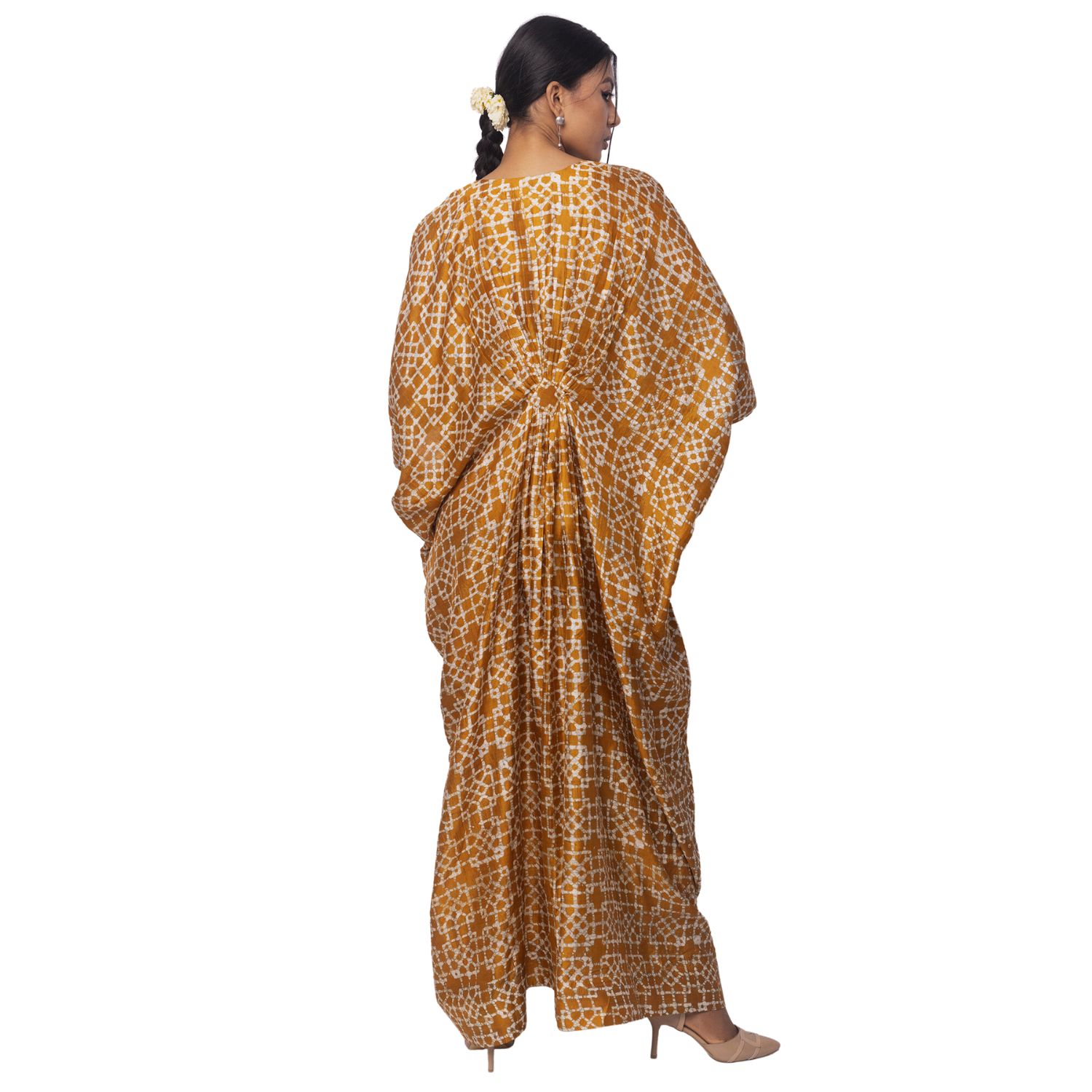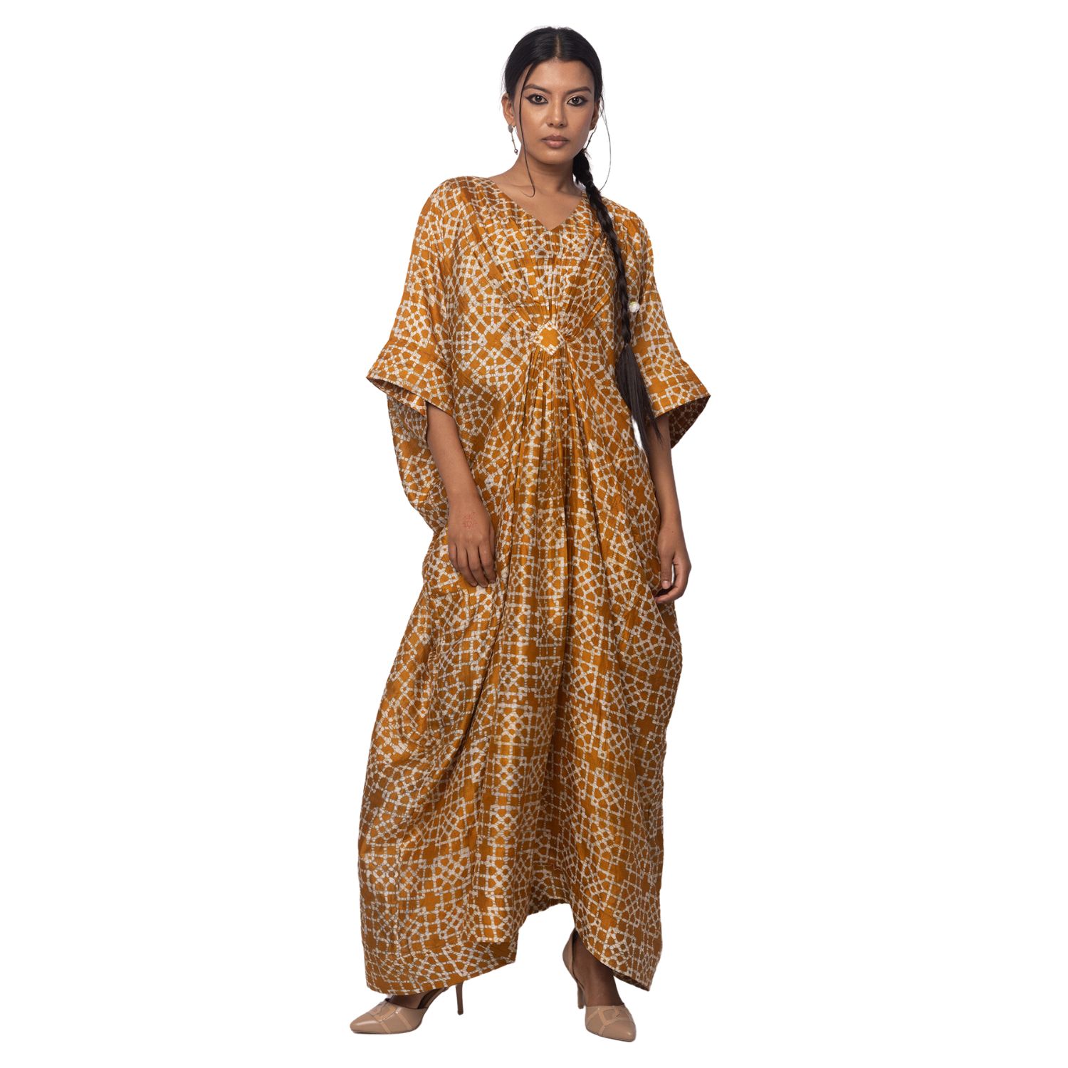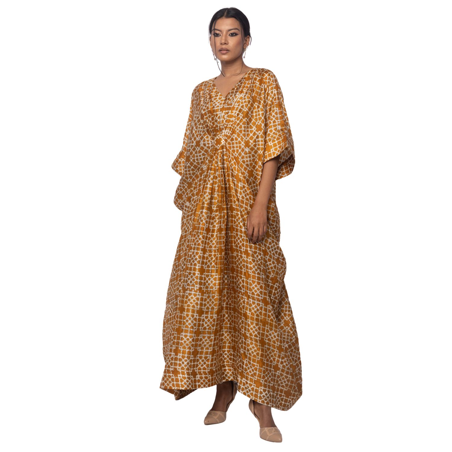 Grab all the attention with this yellow kaftan. Crafted from luxurious mulberry silk, this kaftan drapes elegantly, ensuring a flattering fit. The beautiful batik print in a muddy yellow shade is perfect for a day soiree.