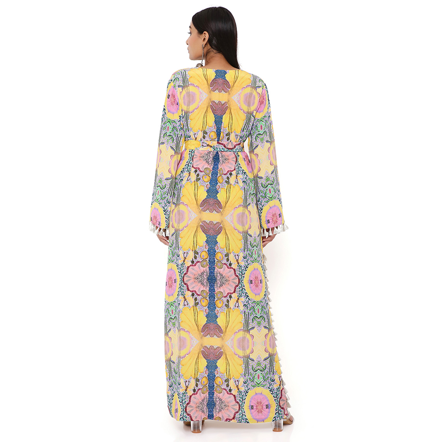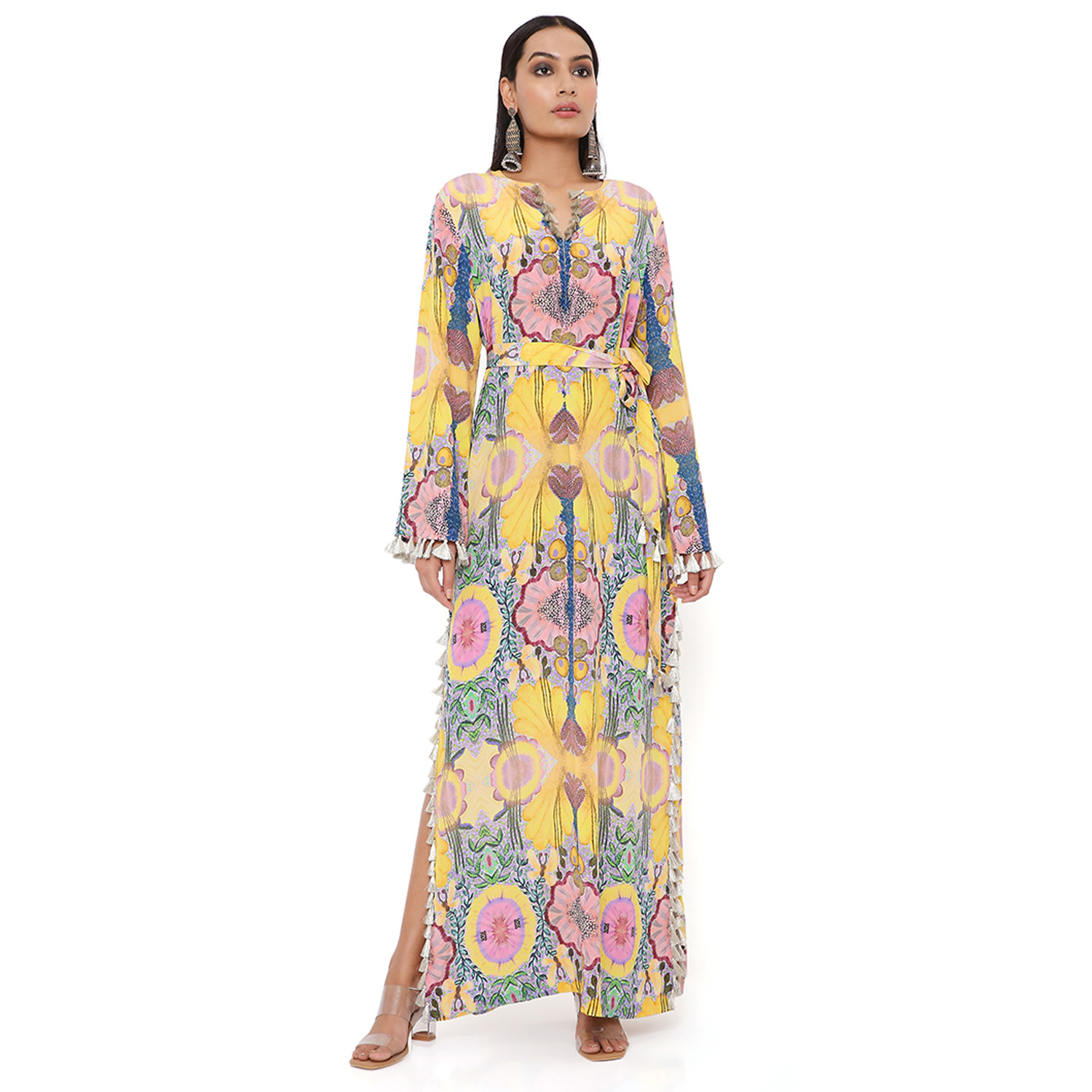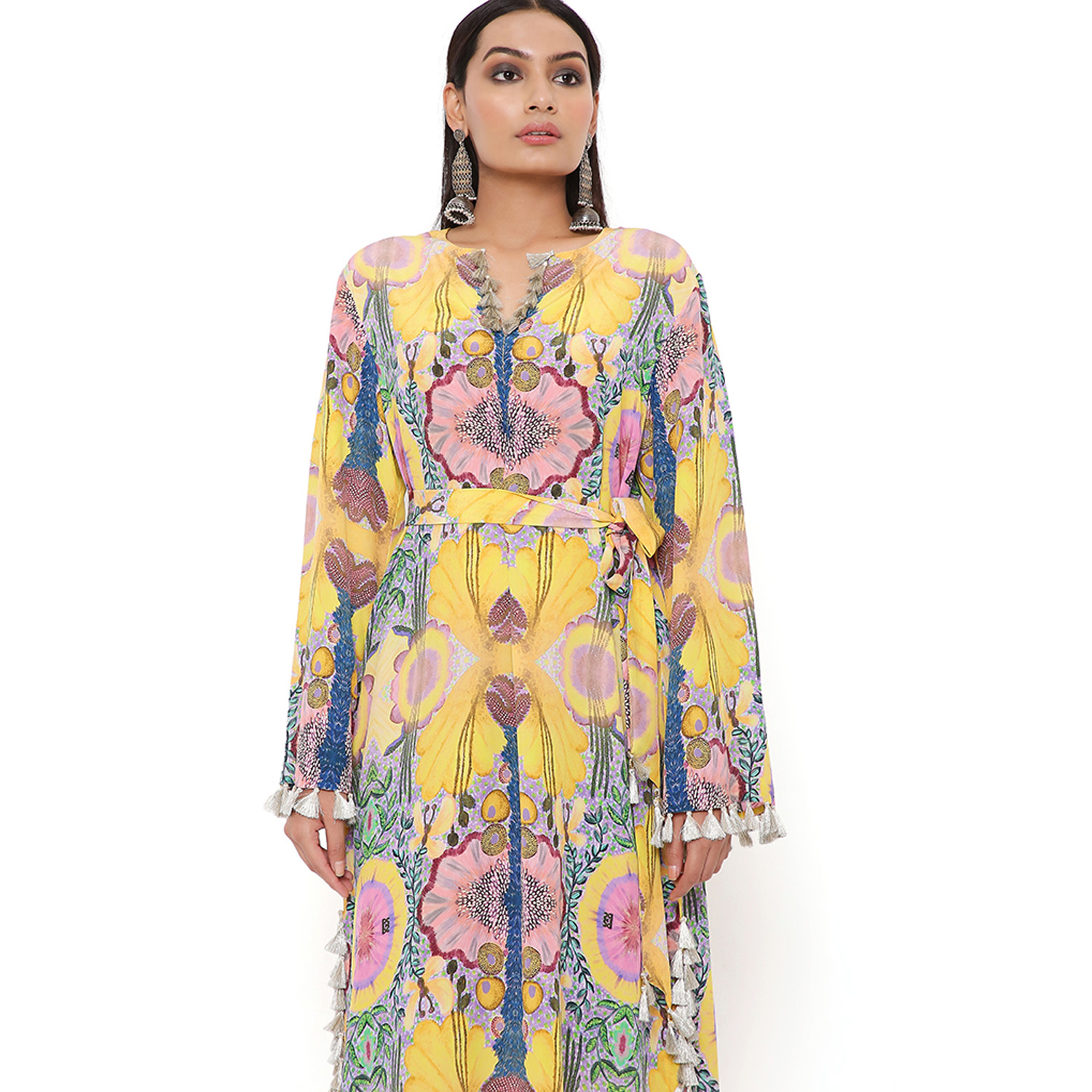 Adorned with an enchanted print on crepe fabric, this features a beautiful mix of blue, purple and pink hues on a yellow base. It has a long length and relaxed fit, ensuring a flowing and effortless silhouette. Style it with statement jewellery and heels for a dressy evening soiree.