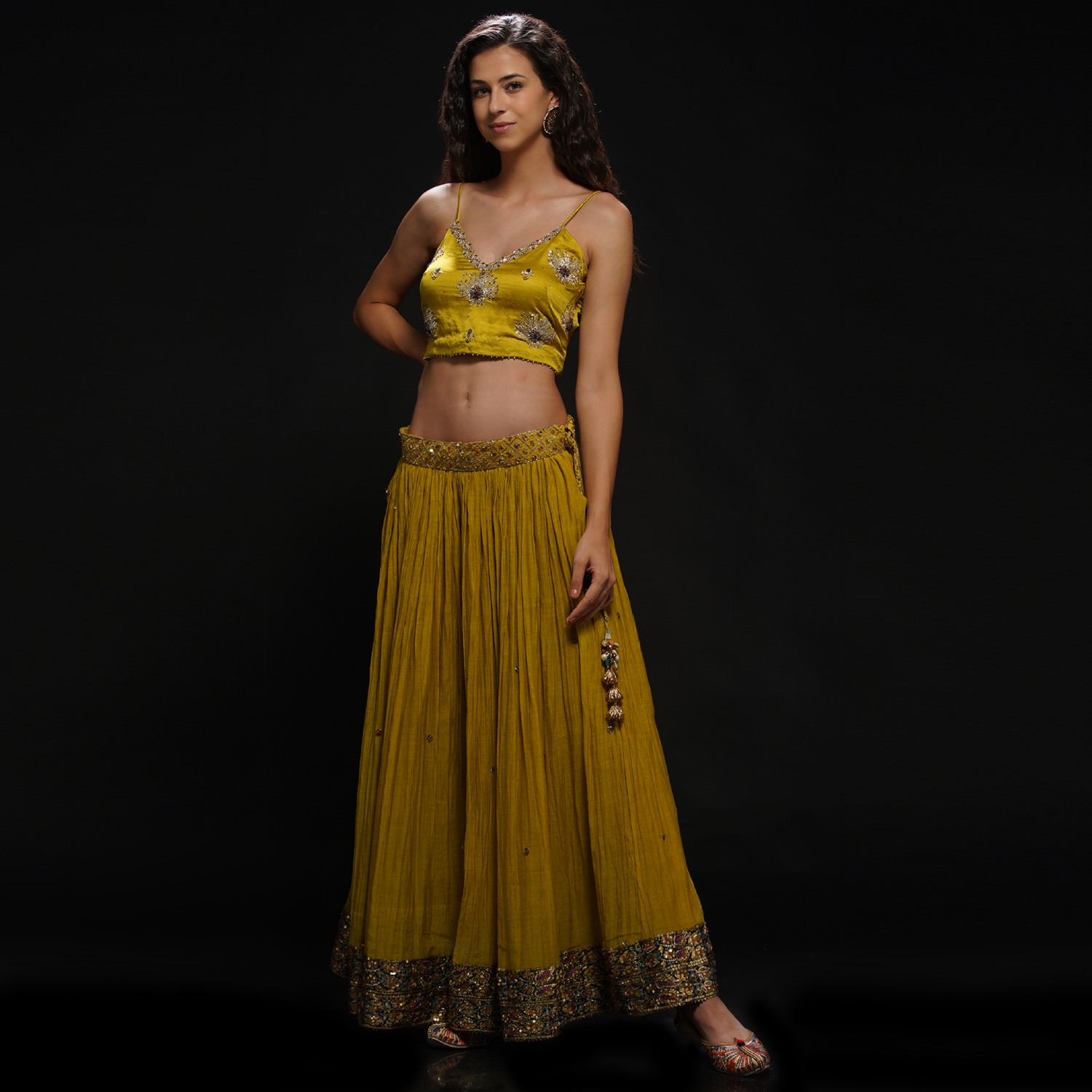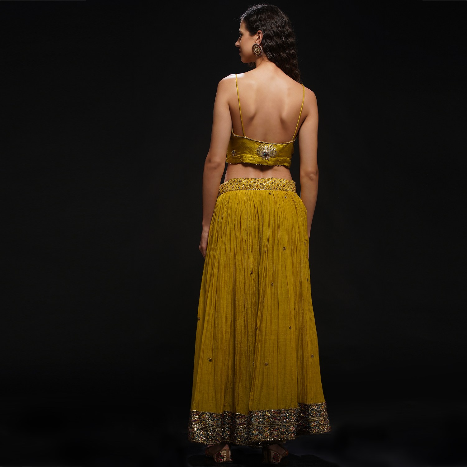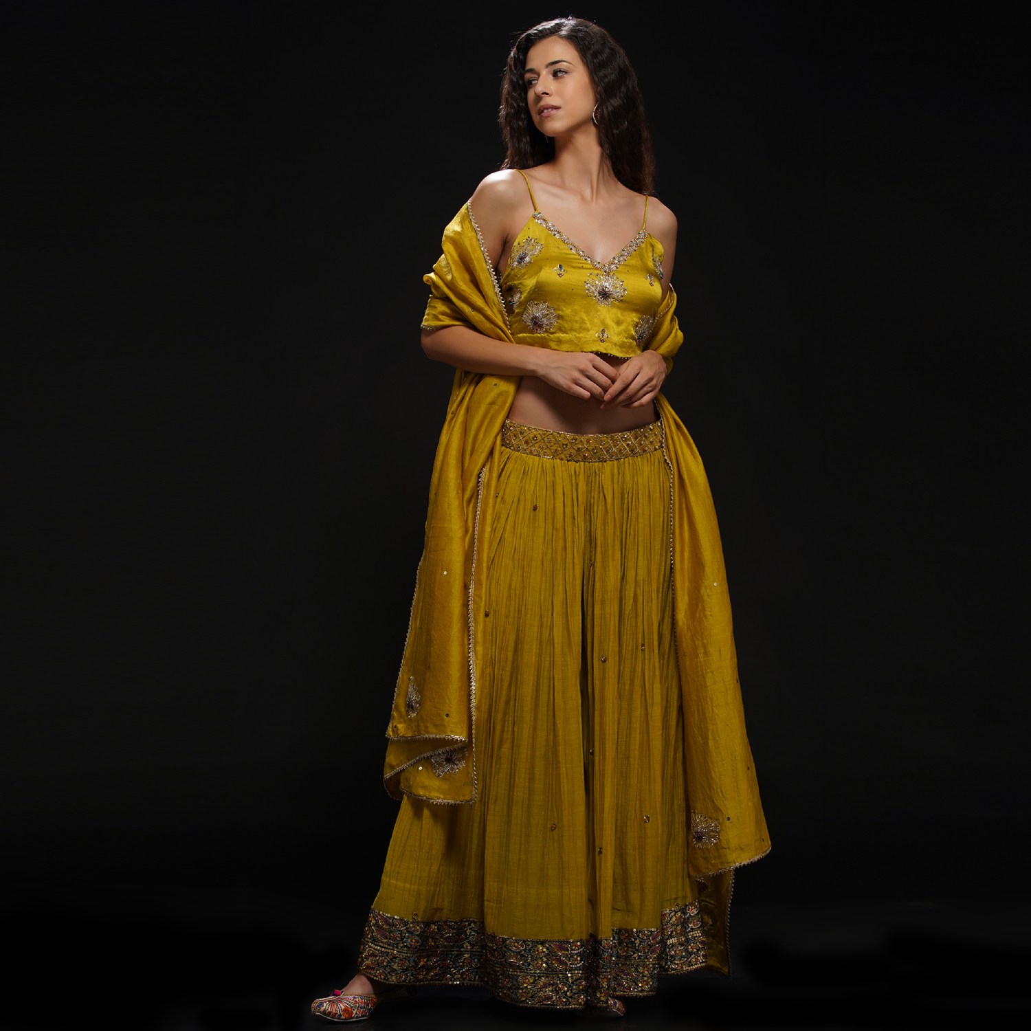 ₹ 36,500 (10% off)This stunning embroidered set comes in a stunning yellow shade. It features wide-legged farshi palazzo bottoms with exquisite hand embroidery at the bottom and waist. Accompanying the palazzo is a hand-peeta work bralette top, adding elegance to the ensemble. The set is completed with a chanderi dupatta that enhances the whole look. Pair this outfit with statement earrings and heels for weddings and festivities.