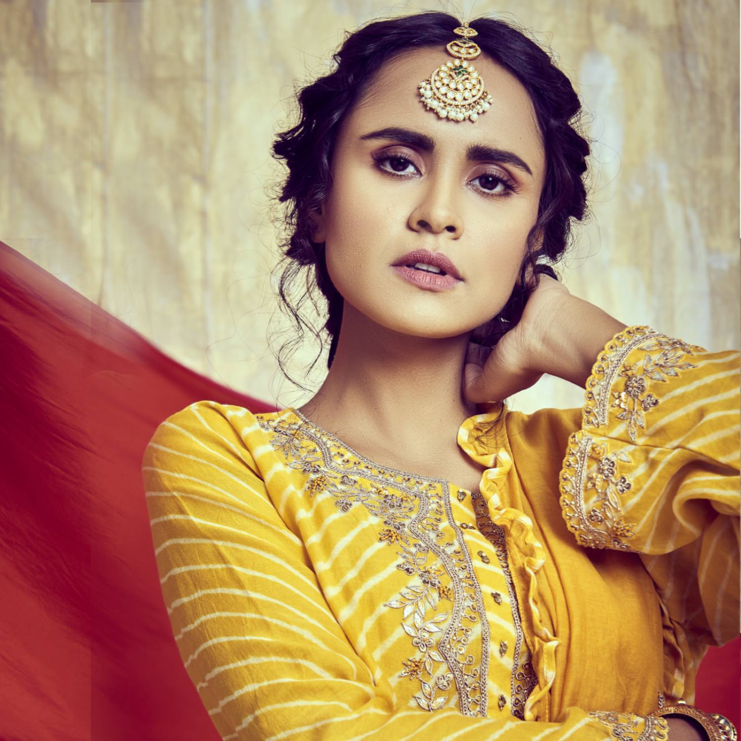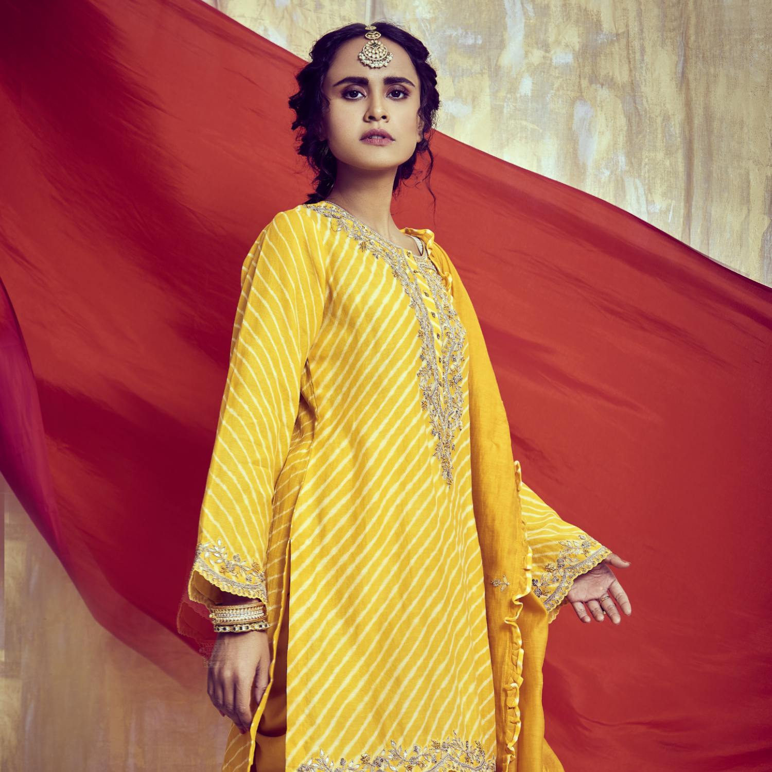 This yellow leheriya set comprises a short kurta, dhoti, and a matching dupatta. It is adorned with delicate zari and gota embellishments, adding grace. Crafted from high-quality silk chanderi and modal satin fabric, it offers a luxurious feel. Style it with minimal accessories and heels for a dressy day event.