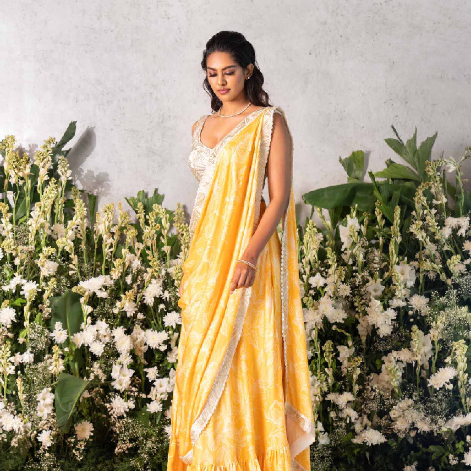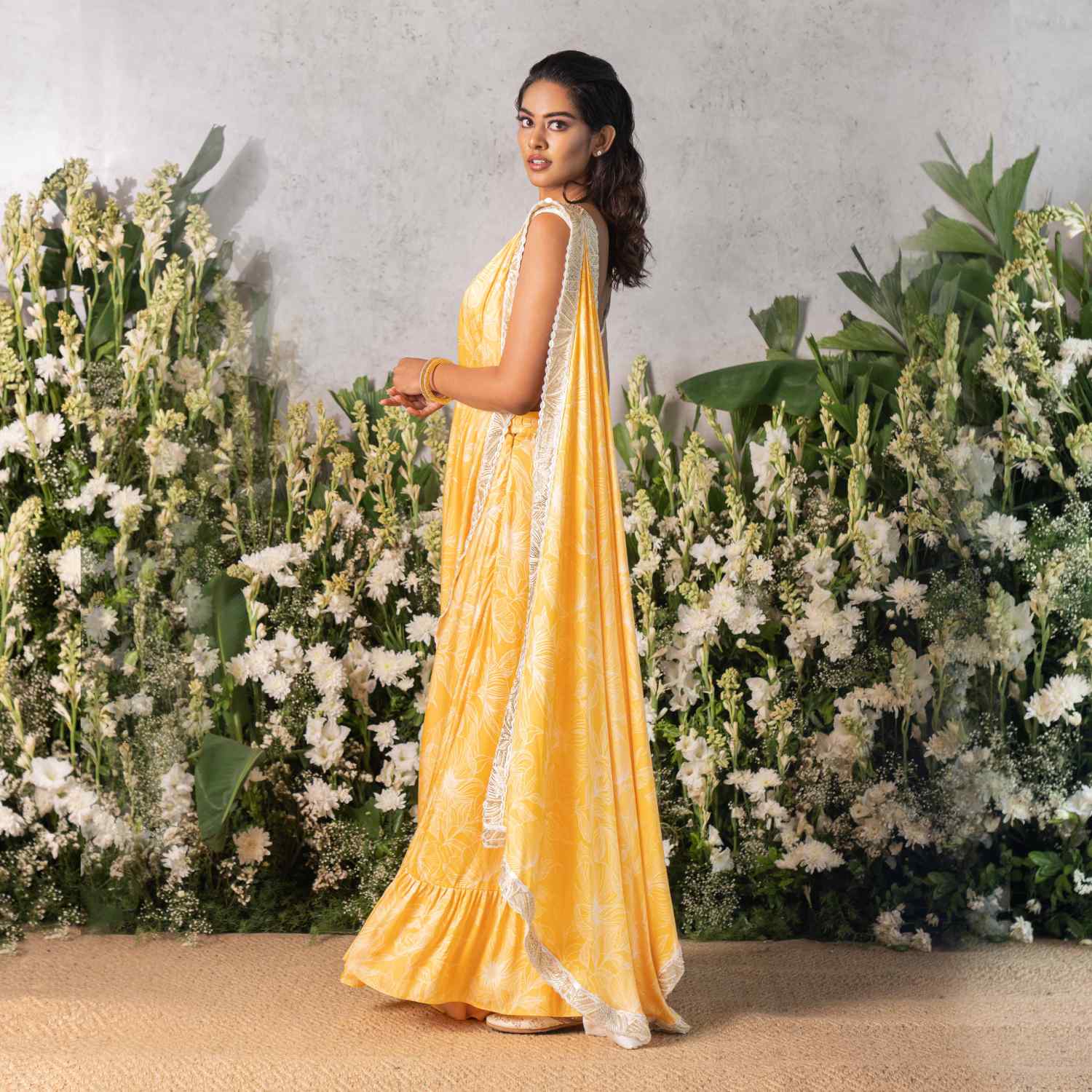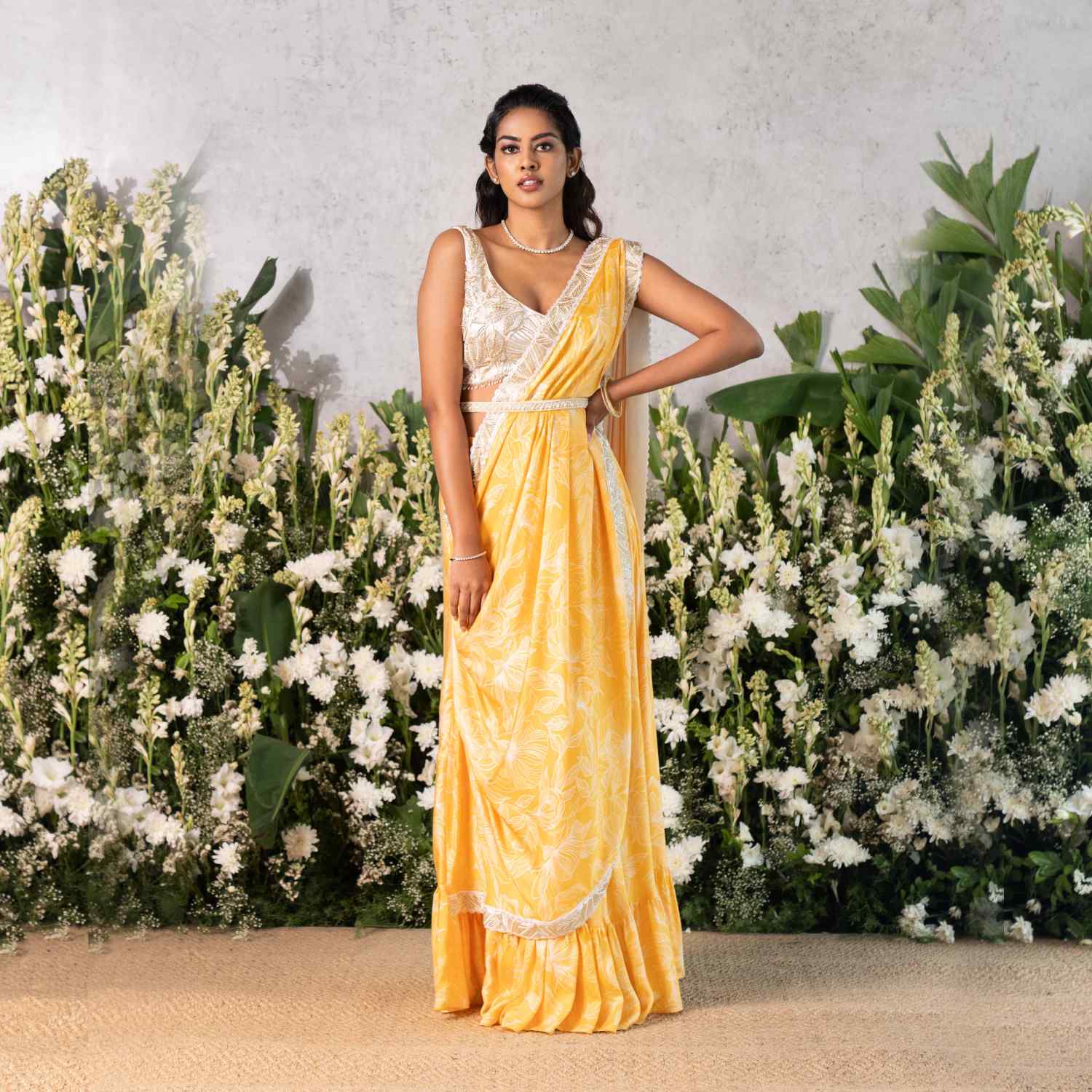 ₹ 60,750 (10% off)Crafted with modal satin, this pre-draped saree features a stunning yellow printed design with a hand-embellished border that exudes opulence. Paired with the saree is a sleeveless blouse in an ivory hue. Pair this saree with bold earrings and heels for weddings or festivities.