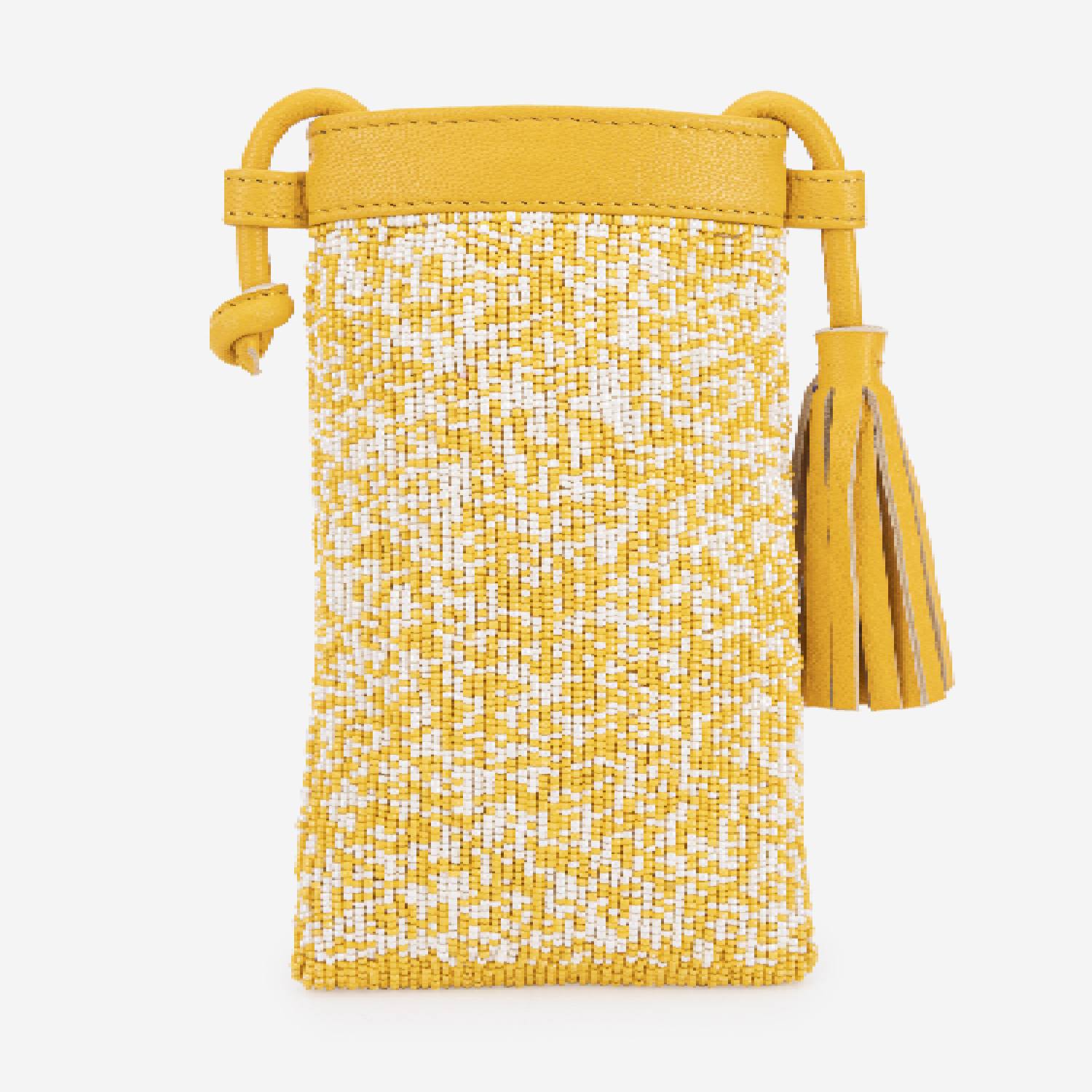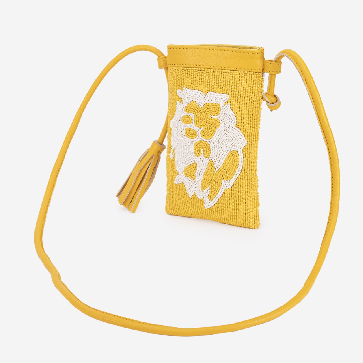 This beautiful bag is made from a combination of leather and beads, providing a mix of textures. The bag has a fringe detailing and is equipped with a magdot closure, ensuring the security of your belongings. This sling bag features yellow and white colors, offering elegance to the look. Pair it with a dress and oversized sunglasses for a boho look.