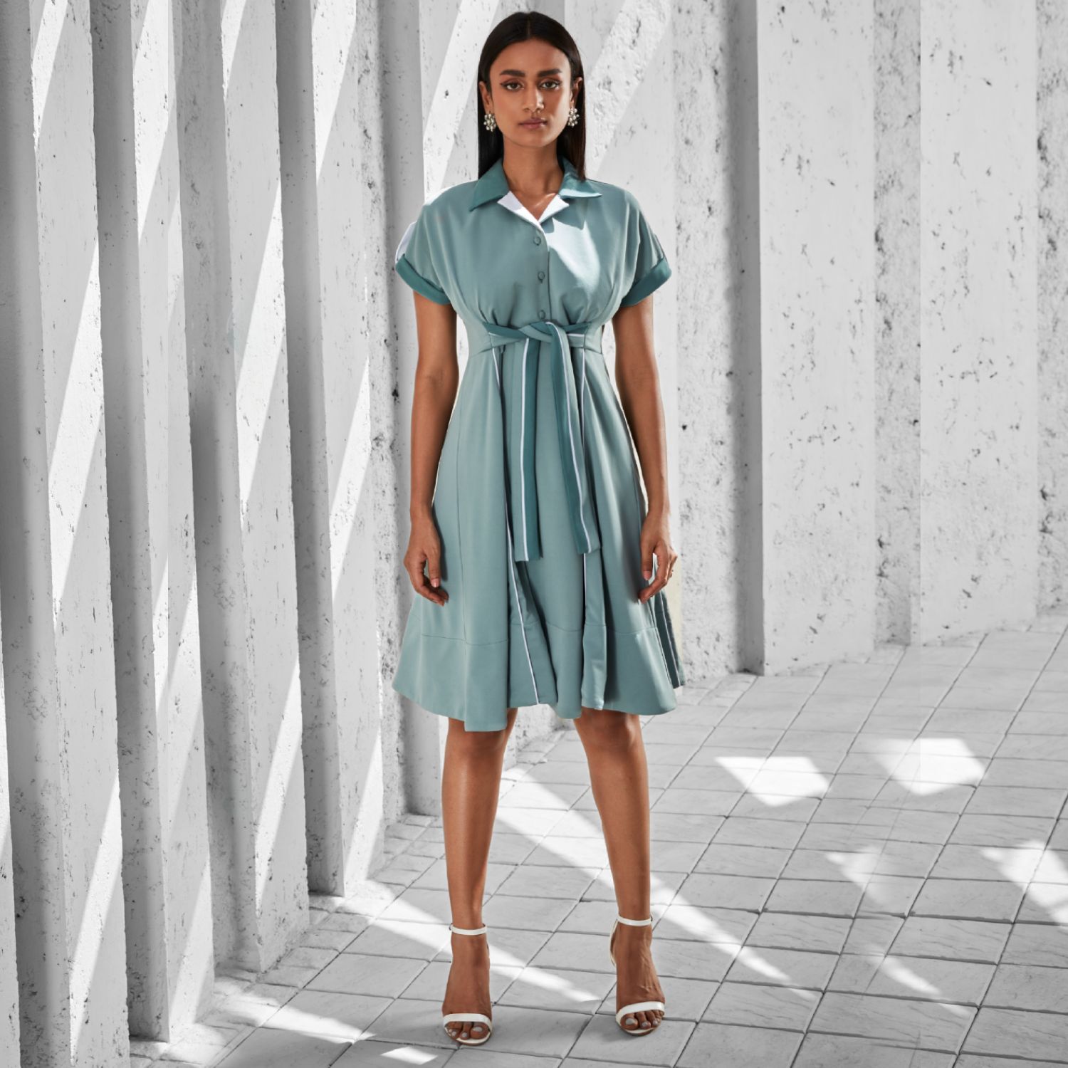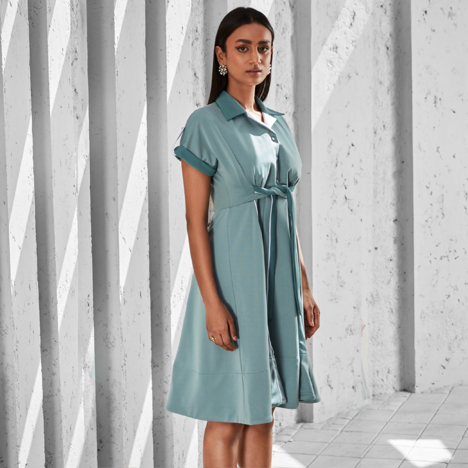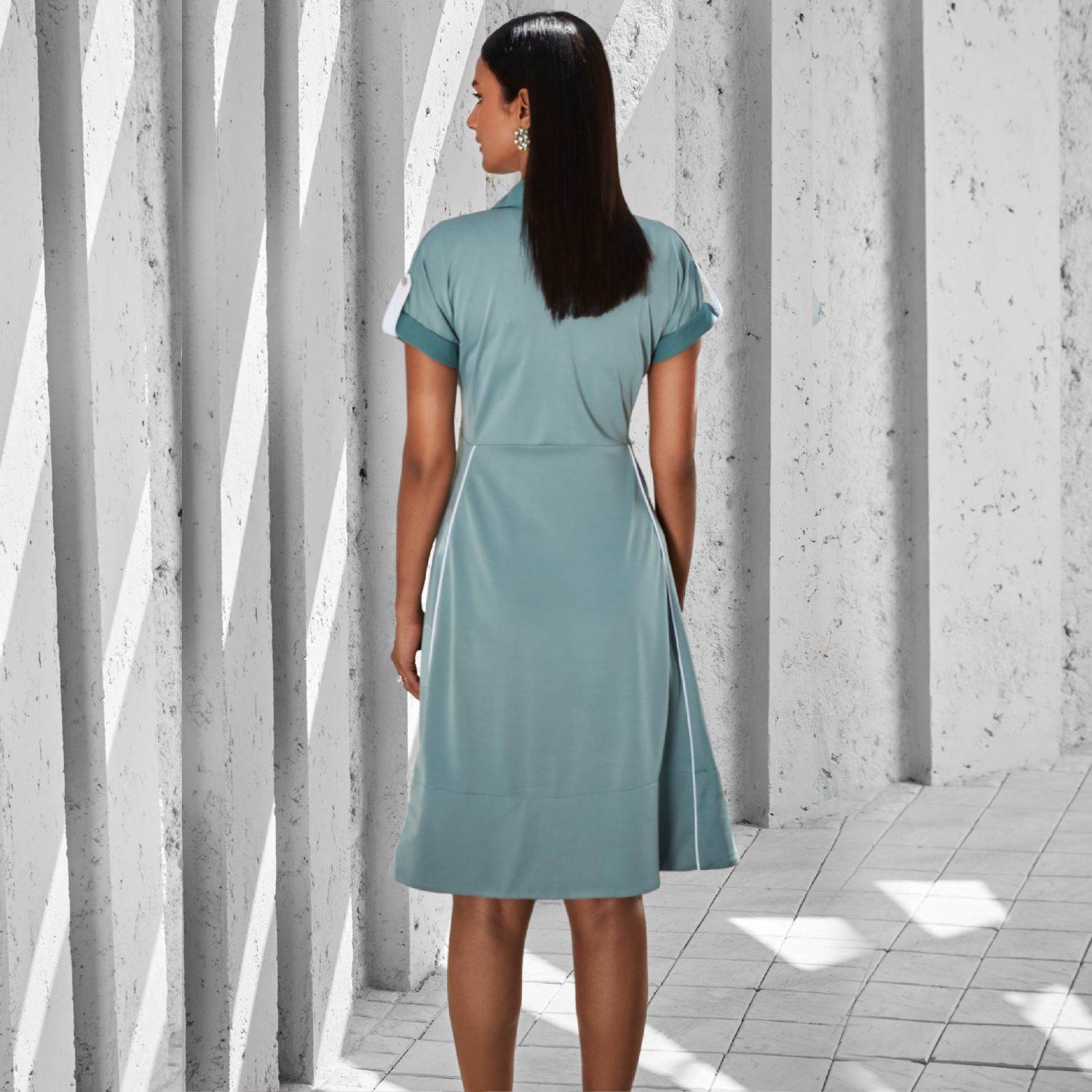 This chic dress is a knee-length fit and flare dress in a refreshing aqua color. It features an open collar and stylish roll-up teal half sleeves with white tabs. The dress includes a white and teal collar, a front tie belt, and white edgings for contrast and detailing. Style this dress with neutral heels and a sling bag for a dressy event.
